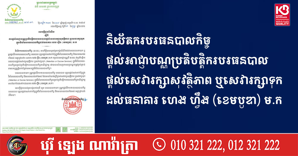 (ភ្នំពេញ)៖ និយ័តករបរធនបាលកិច្ច បានចេញសេចក្តីជូនដំណឹង ស្តីពី ការផ្តល់អាជ្ញាបណ្ណប្រតិបត្តិករបរធនបាល ផ្តល់សេវារក្សាសុវត្ថិភាព ឬសេវារក្សាទុក ក្នុងវិស័យបរធនបាលកិច្ច ដល់ធនាគារ ហេង ហ្វឹង (ខេមបូឌា) ម.ក។