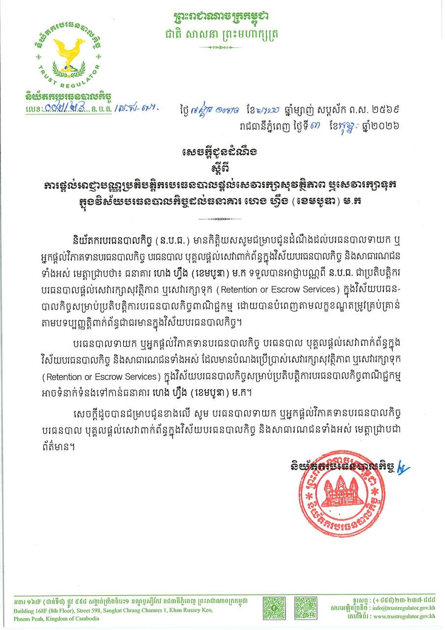សេចក្តីជូនដំណឹង បានឲ្យដឹងថា ធនាគារ ហេង ហ្វឹង (ខេមបូឌា) ម.ក ទទួលបានអាជ្ញាបណ្ណពី ន.ប.ធ. ជាប្រតិបត្តិករបរធនបាល ផ្តល់សេវារក្សាសុវត្ថិភាព ឬសេវារក្សាទុក (Retention or Escrow Services) ក្នុងវិស័យបរធនបាលកិច្ច សម្រាប់ប្រតិបត្តិការបរធនបាលកិច្ចពាណិជ្ជកម្ម ដោយបានបំពេញតាមលក្ខខណ្ឌតម្រូវគ្រប់គ្រាន់ តាមបទប្បញ្ញត្តិពាក់ព័ន្ធជាធរមាន ក្នុងវិស័យបរធនបាលកិច្ច។