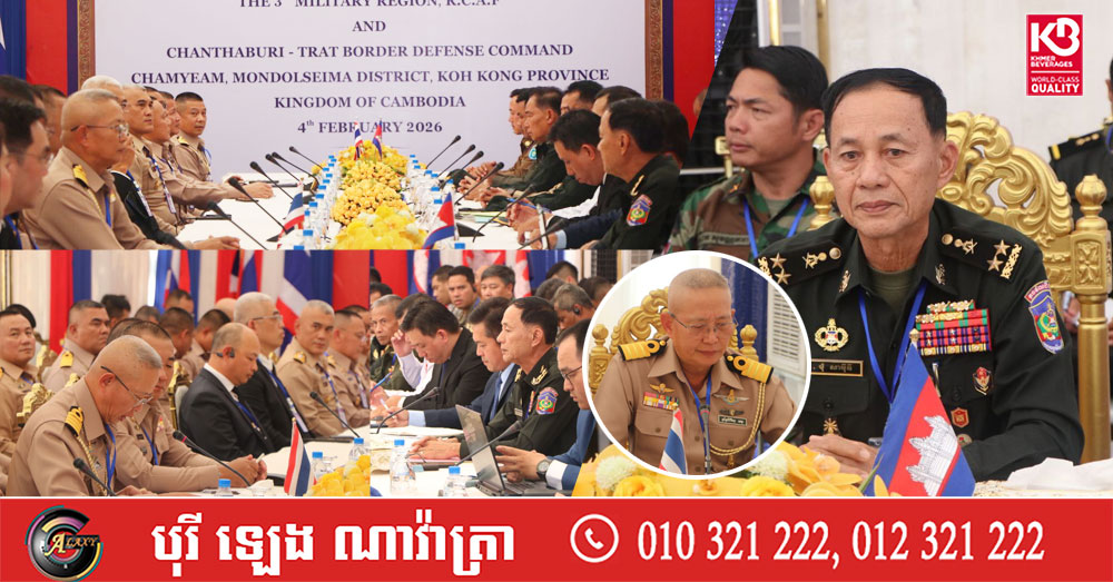 (ភ្នំពេញ)៖ នៅរសៀលថ្ងៃទី៤ ខែកុម្ភៈ ឆ្នាំ២០២៦នេះ ក្រុមលេខាធិការដ្ឋាន នៃគណៈកម្មាធិការព្រំដែនថ្នាក់យោធភូមិភាគ កម្ពុជា-ថៃ (RBC) រវាងយោធភូមិភាគទី៣ ភាគីកម្ពុជា និងបញ្ជាការការពារព្រំដែនចន្ទបុរី-ត្រាត ភាគីថៃ បានជួបប្រជុំគ្នានៅច្រកអន្តរជាតិចាំយាម-ហាតលឹក ស្រុកមណ្ឌលសីម៉ា ខេត្តកោះកុង ក្រោមការសង្កេតការណ៍ពីក្រុមអ្នកសង្កេតការណ៍អាស៊ាន (AOT) របស់កម្ពុជា និងថៃ។