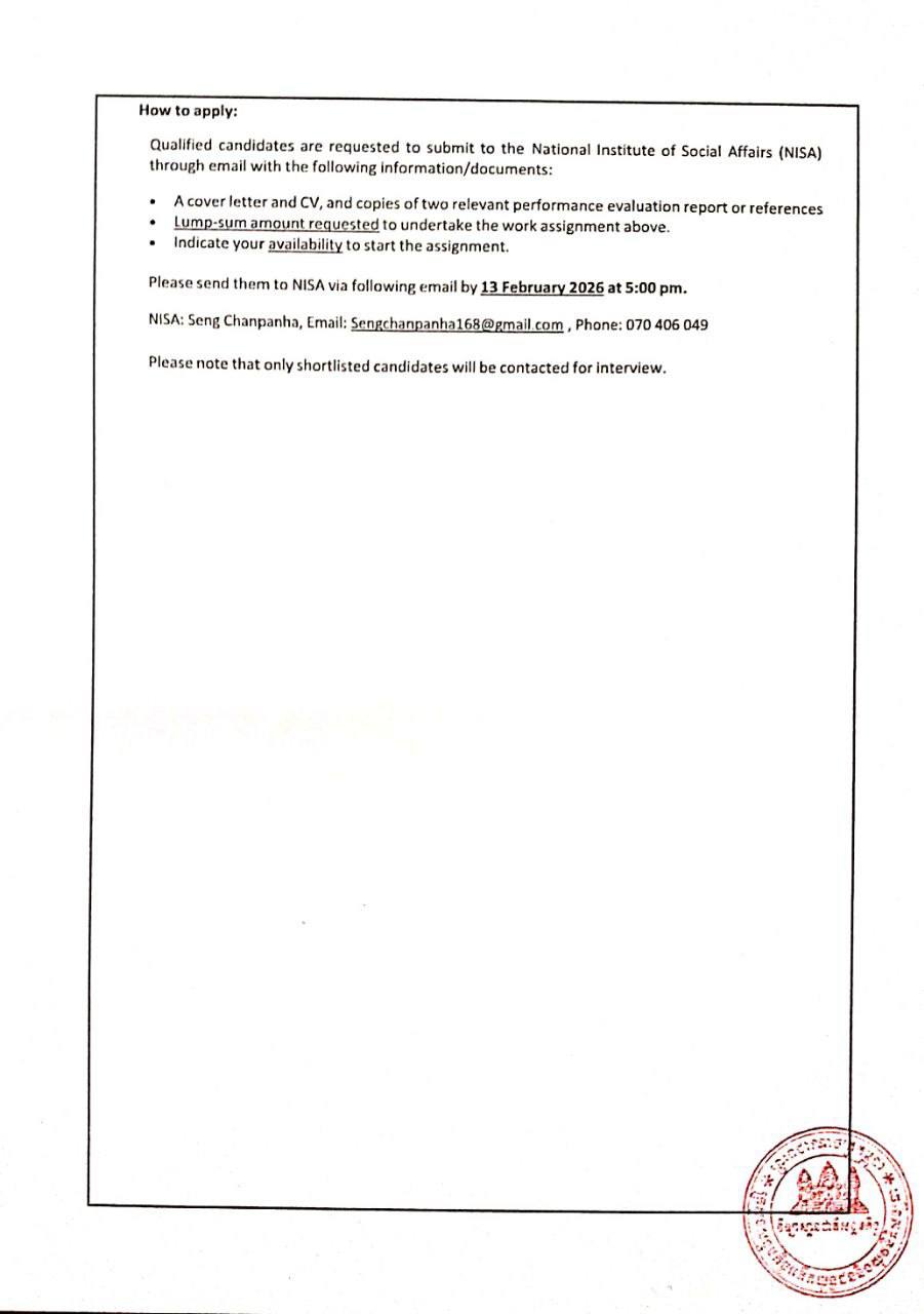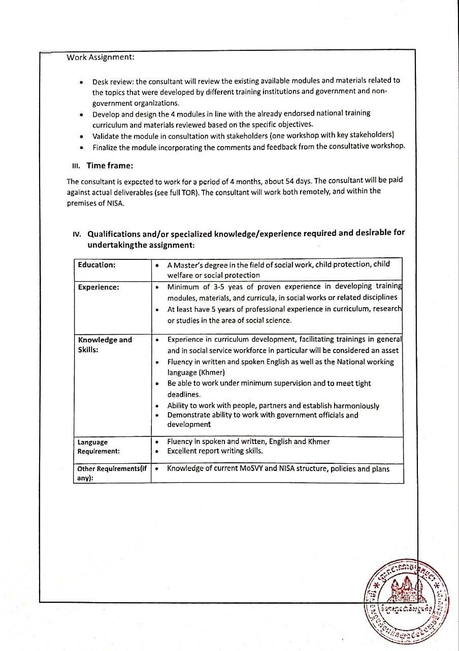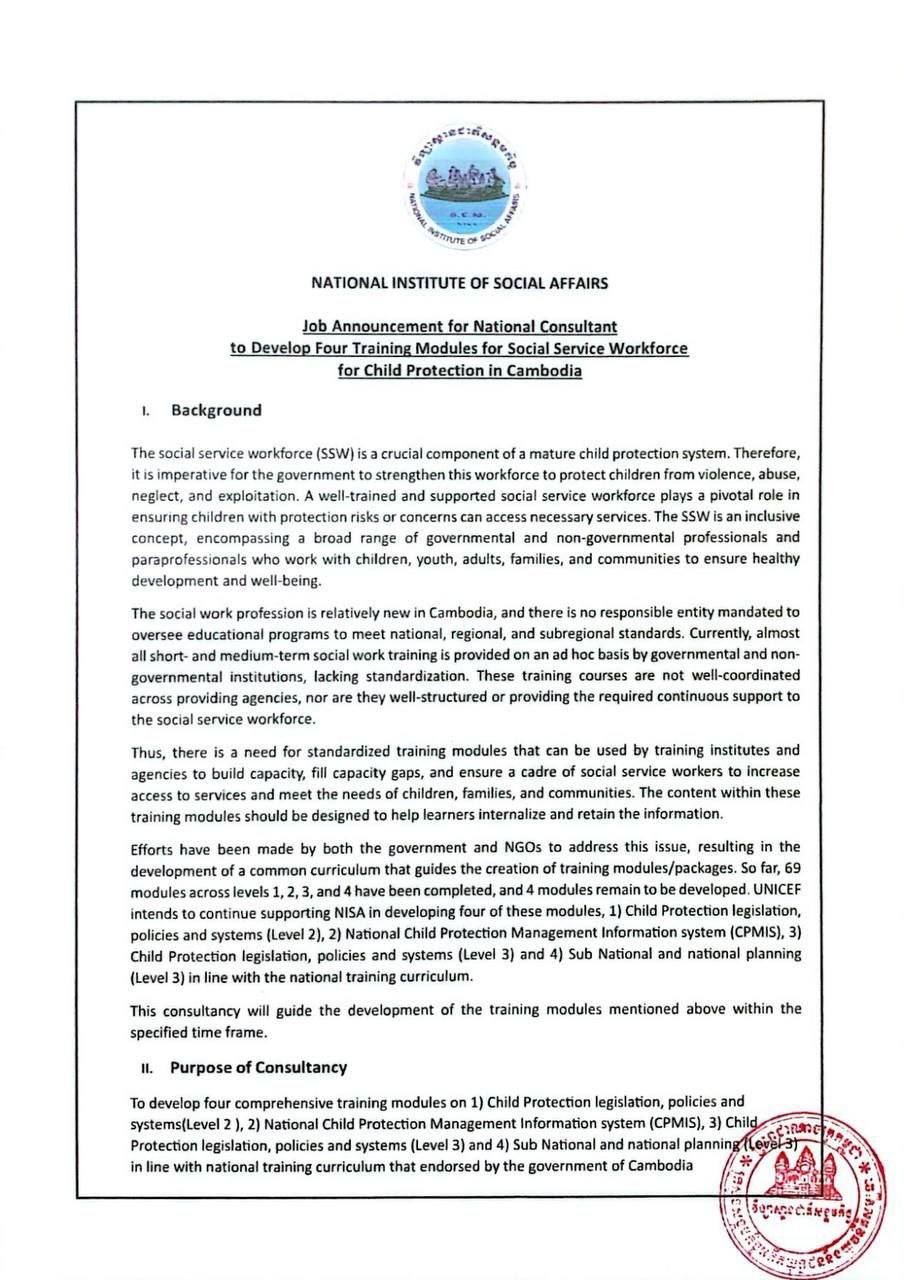 (ភ្នំពេញ)៖ វិទ្យាស្ថានជាតិសង្គមកិច្ច ក្រោមកិច្ចសហប្រតិបត្តិការ ជាមួយអង្គការ Unicef សូមប្រកាសជ្រើសរើសទីប្រឹក្សាជាតិ ដើម្បីរៀបចំអភិវឌ្ឍន៍ម៉ូឌុល ស្តីពីការអភិវឌ្ឍន៍កម្លាំងសេវាសង្គមផ្តោតលើកិច្ចការពារកុមារ ស្របតាមកម្មវិធីសិក្សាស្តីពីការបណ្តុះបណ្តាលកម្លាំងសេវាសង្គមកិច្ច។