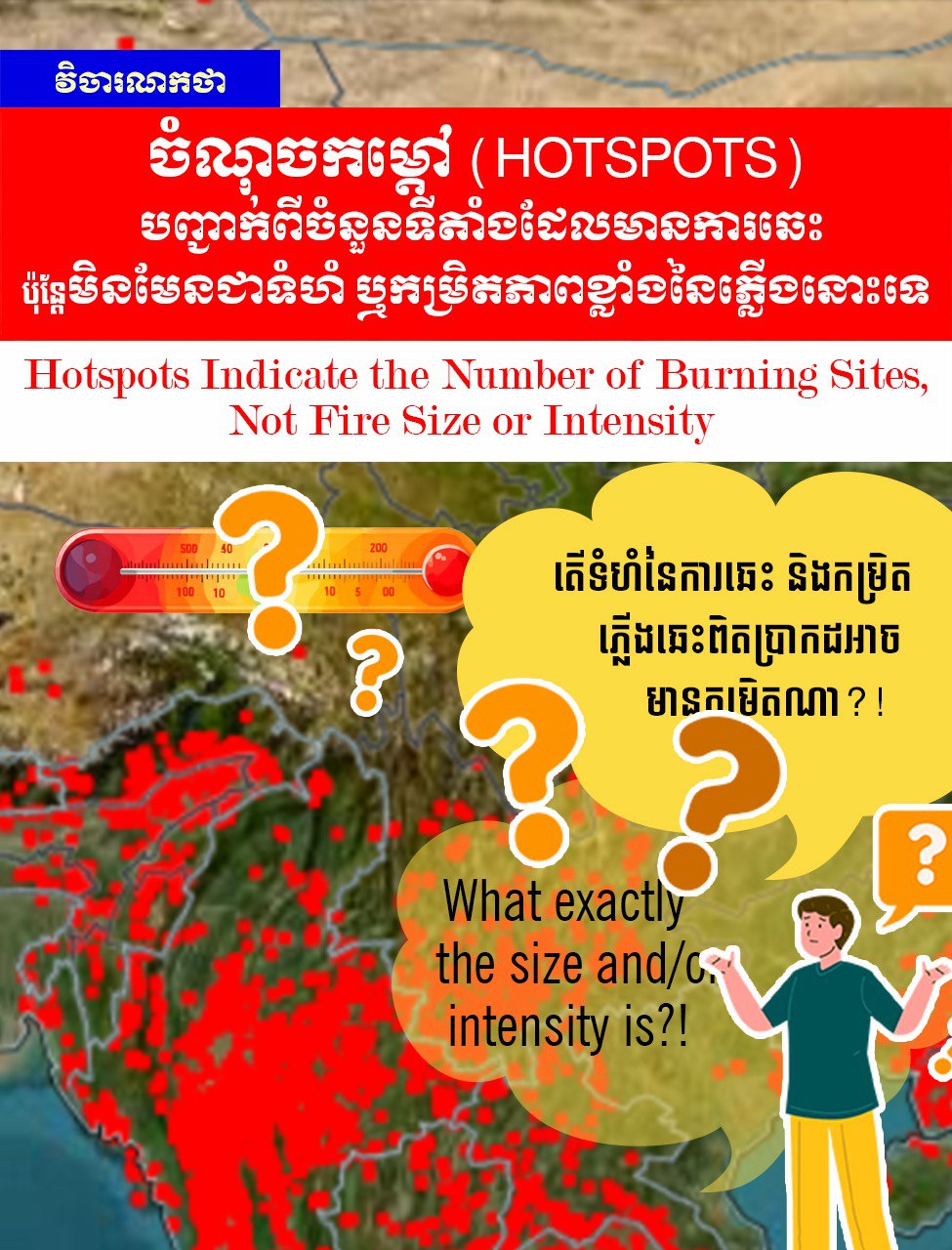 វិចារណកថា៖ ចំណុចកម្តៅ (Hotspots) បញ្ជាក់ពីចំនួនទីតាំងដែលមានការឆេះ ប៉ុន្តែមិនមែនជាទំហំ ឬកម្រិតភាពខ្លាំងនៃភ្លើងនោះទេ (អាំងតង់ស៊ីតេ)