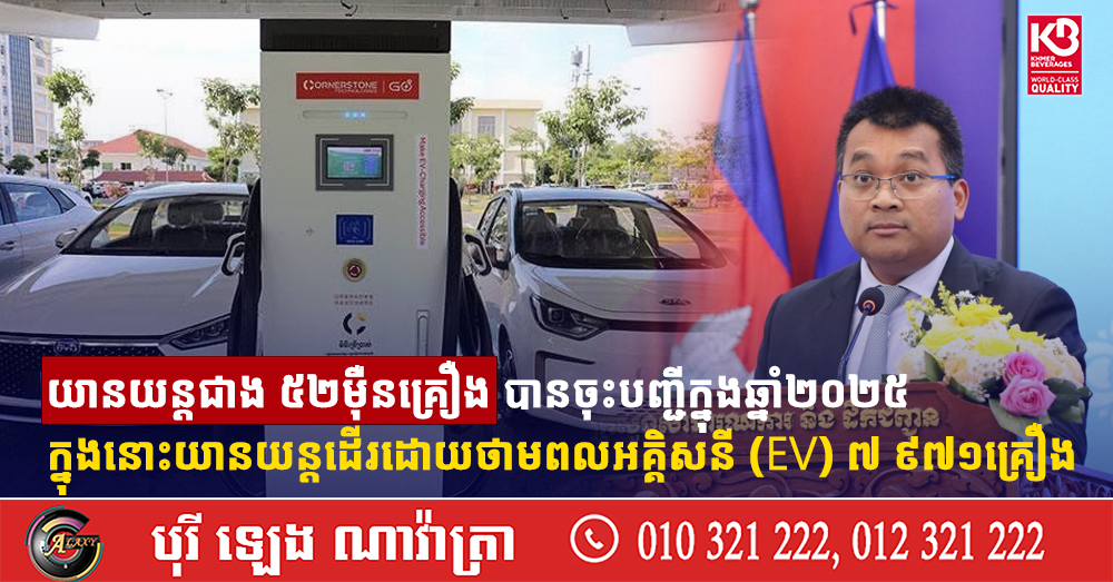 យានយន្តជាង ៥២ម៉ឺនគ្រឿង បានចុះបញ្ជីក្នុងឆ្នាំ២០២៥ ក្នុងនោះយានយន្តដើរដោយថាមពលអគ្គិសនី (EV) ៧ ៩៧១គ្រឿង
