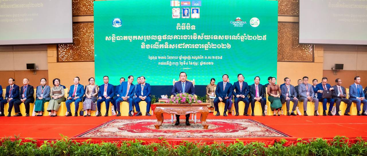 (ភ្នំពេញ)៖ លោក ហួត ហាក់ រដ្ឋមន្ត្រីក្រសួងទេសចរណ៍ នៅថ្ងៃទី៤ ខែកុម្ភៈ ឆ្នាំ២០២៦ អញ្ជើញជាអធិបតី ក្នុងពិធីបិទសន្និបាតបូកសរុបលទ្ធផលការងារវិស័យទេសចរណ៍ឆ្នាំ២០២៥ និងលើកទិសដៅការងារ ឆ្នាំ២០២៦ ដែលបានឆ្លុះបញ្ចាំងពីសមិទ្ធផលយ៉ាងត្រចះត្រចង់រយៈពេលមួយឆ្នាំរបស់មហាគ្រួសារវិស័យទេសចរណ៍ ពោលគឺយើងបានរួមគ្នាពិភាក្សា វាយតម្លៃ និងឆ្លុះបញ្ចាំងយ៉ាងស៊ីជម្រៅ អំពីសមិទ្ធផល បញ្ហាប្រឈម សំណូមពរ និងកាលានុវត្តភាពនៅក្នុងវិស័យទេសចរណ៍កម្ពុជា ដោយមានចំនួនអ្នកចូលរួមយ៉ាងច្រើនកុះករ និងការផ្តល់មតិយោបល់យ៉ាងសកម្មផុសផុល ពីសំណាក់បងប្អូនសមាជិក-សមាជិកាទាំងអស់ ដើម្បីរួមគ្នាផ្តល់ជាធាតុចូលយ៉ាងសំខាន់សម្រាប់លើកទិសដៅអភិវឌ្ឍន៍វិស័យទេសចរណ៍នៅកម្ពុជា ឱ្យកាន់តែមានភាពប្រសើរឡើង។