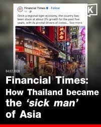 (ភ្នំពេញ)៖ កាសែតបរទេសល្បីៗ និងកាសែតក្នុងស្រុករបស់ថៃ បាននិយាយអំពីភាពធ្លាក់ចុះនៃ ប្រទេសថៃ ដែលធ្លាប់ជាខ្លាសេដ្ឋកិច្ចមួយនៅអាស៊ី។ ការវិភាគមួយចំនួនបានប្រៀបធៀបស្ថានភាពនេះ ទៅនឹងជំងឺរ៉ាំរ៉ៃ ដែលថៃមានស្រាប់យូរមកហើយ ប៉ុន្តែត្រូវបានពន្យារពេលដោយមិនព្រមព្យាបាល។