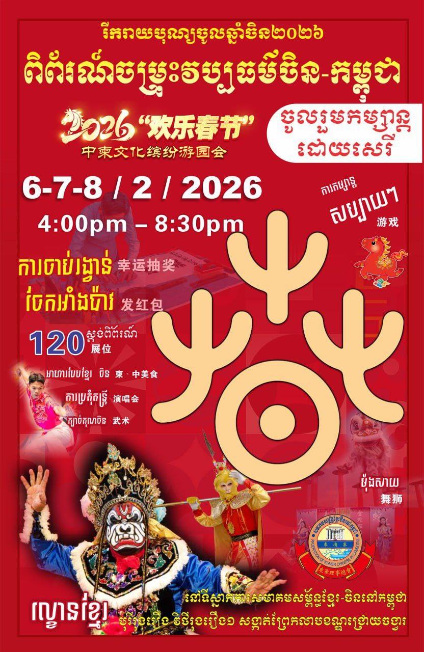 (ភ្នំពេញ)៖ នៅព្រឹកថ្ងៃទី៥ ខែកុម្ភៈ ឆ្នាំ២០២៦ ដោយមានការគាំទ្រពីស្ថានទូតចិន ប្រចាំនៅកម្ពុជា ក្រុមយុវជន នៃសមាគមសម្ព័ន្ធខ្មែរចិននៅកម្ពុជា បានធ្វើពិធីក្រុងពាលីបួងសួងសុំសេចក្តីសុខសប្បាយ ក្នុងការបើកព្រឹត្តិការណ៍ពិព័រណ៍ចម្រុះវប្បធម៌ចិន-កម្ពុជា រយៈពេល៣ថ្ងៃ ដែលរៀបចំឡើងចាប់ពីថ្ងៃទី៦ ដល់ទី៨ ខែកុម្ភៈ ឆ្នាំ២០២៦ នៅទីស្នាក់ការសមាគមសម្ព័ន្ធខ្មែរ-ចិន នៅកម្ពុជា នៅមុខបុរីរុងរឿង វិថីរុងរឿង១ សង្កាត់ព្រៃកលាប ខណ្ឌជ្រោយចង្វារ រាជធានីភ្នំពេញ ដើម្បីអបអរសាទរពិធីបុណ្យចូលឆ្នាំថ្មីប្រពៃណិចិន ឆ្នាំ២០២៦ ដែលនឹងឈានចូលមកដល់ឆាប់ៗខាងមុខនេះ។