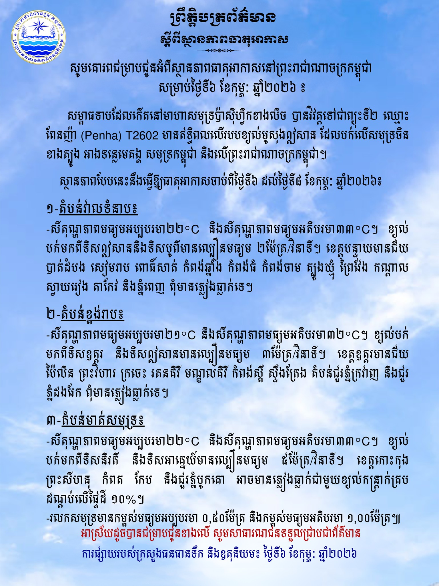 ក្រសួងធនធានទឹក ជូនដំណឹងអំពីស្ថានភាពធាតុអាកាសនៅកម្ពុជា សម្រាប់ថ្ងៃទី៦ ខែកុម្ភៈ ឆ្នាំ២០២៦