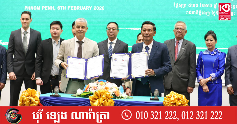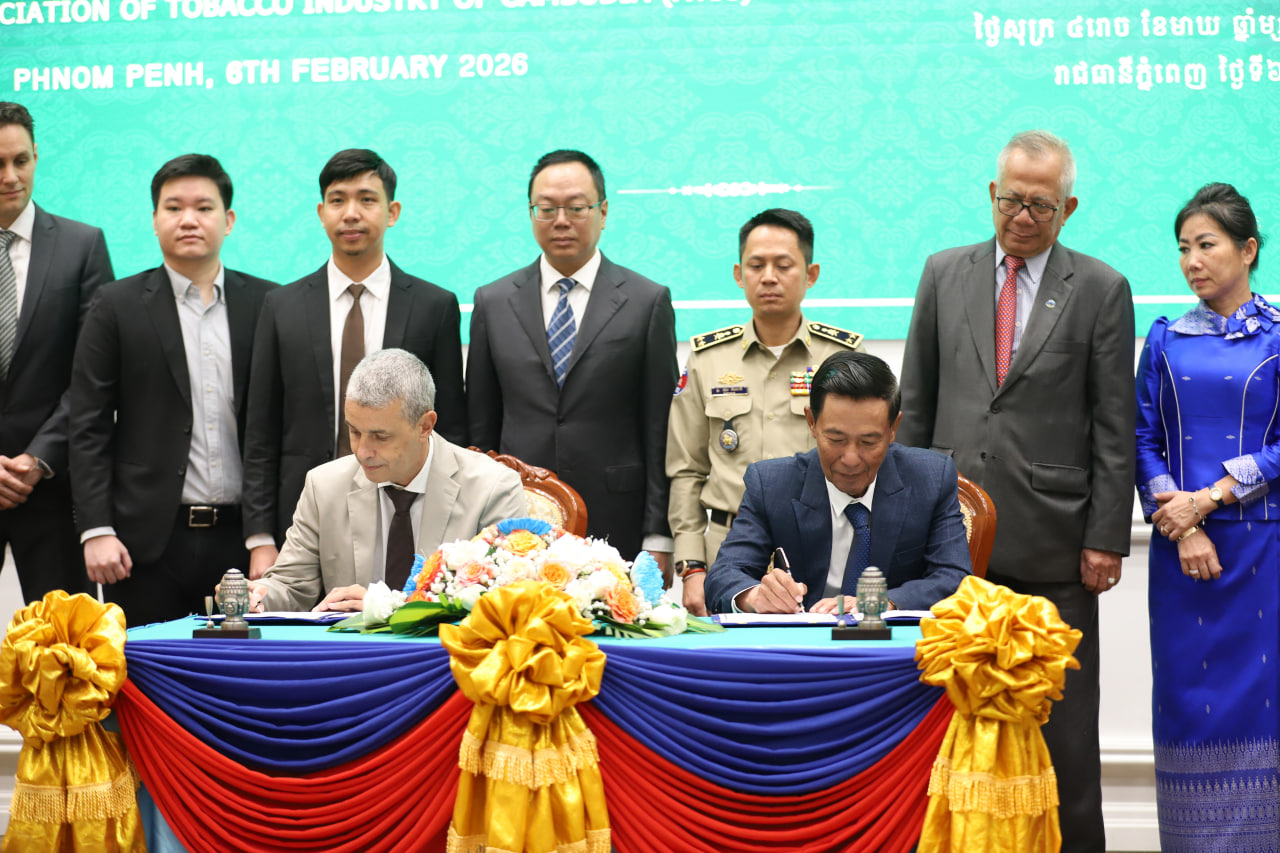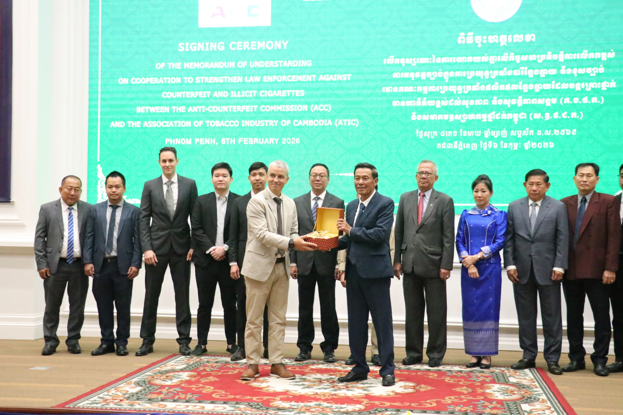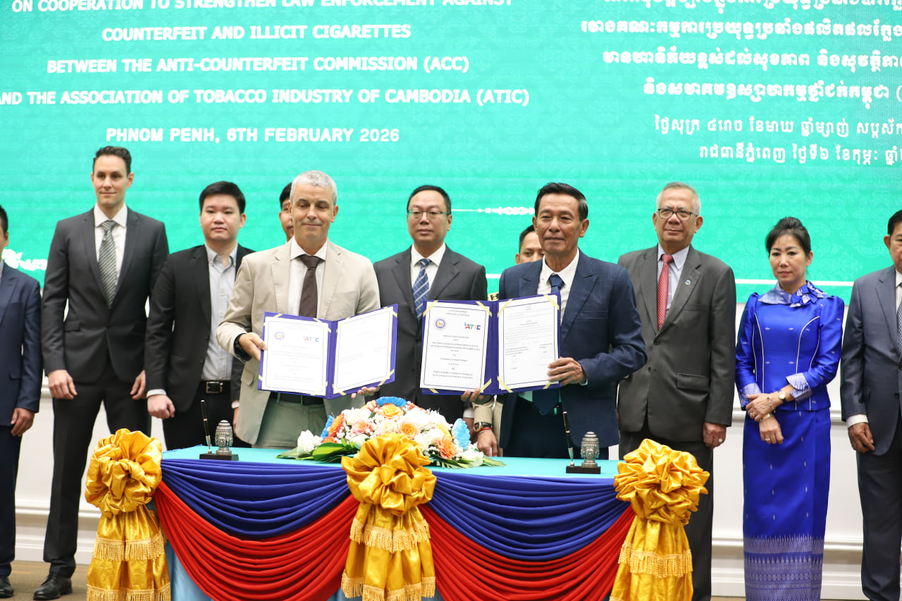 (ភ្នំពេញ)៖ ដោយទទួលបានការអនុញ្ញាតពីលោកអភិសន្តិបណ្ឌិត ស សុខា ឧបនាយករដ្ឋមន្ត្រី រដ្ឋមន្ត្រីក្រសួងមហាផ្ទៃ គណៈកម្មការប្រយុទ្ធប្រឆាំងផលិតផលក្លែងក្លាយ ដែលបង្កគ្រោះថ្នាក់មានហានិភ័យខ្ពស់ដល់សុខភាព និងសុវត្ថិភាពសង្គម (គ.ប.ផ.ក.) និងសមាគមឧស្សហកម្មថ្នាំជក់កម្ពុជា (ATIC) នៅព្រឹកថ្ងៃទី៦ ខែកុម្ភៈ ឆ្នាំ២០២៦នេះ បានចុះអនុស្សារណៈ នៃការយោគយល់គ្នា ក្រោមអធិបតីភាពលោក នៅ លក្ខណា រដ្ឋលេខាធិការក្រសួងមហាផ្ទៃ និងជាប្រធានគណៈកម្មការប្រយុទ្ធប្រឆាំងផលិតផលក្លែងក្លាយ ដែលបង្កគ្រោះថ្នាក់មានហានិភ័យខ្ពស់ដល់សុខភាព និងសុវត្ថិភាពសង្គម (គ.ប.ផ.ក.) និងលោក Miguel Barros Figueira ប្រធានសមាគមឧស្សាហកម្មថ្នាំជក់កម្ពុជា (ATIC)។
