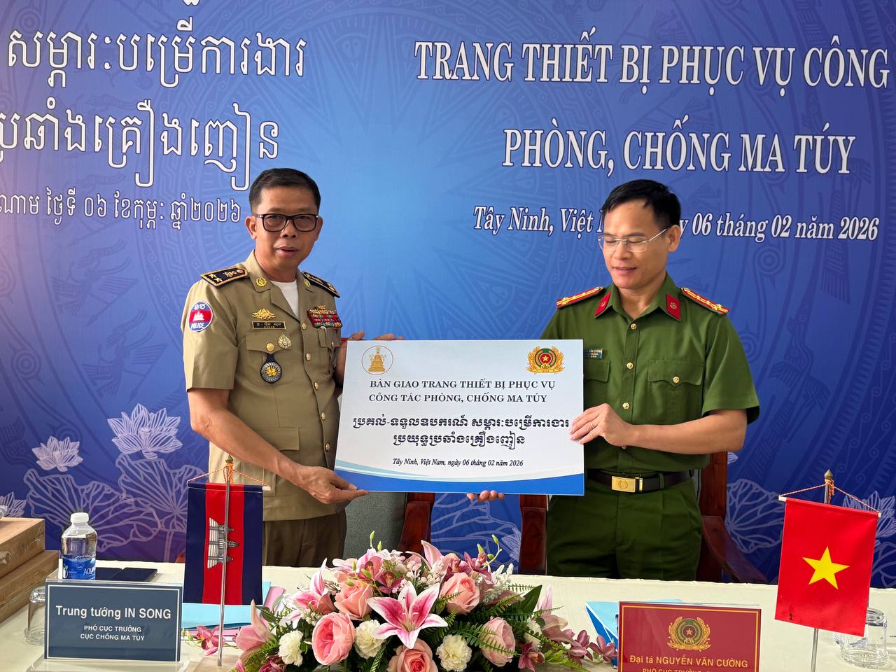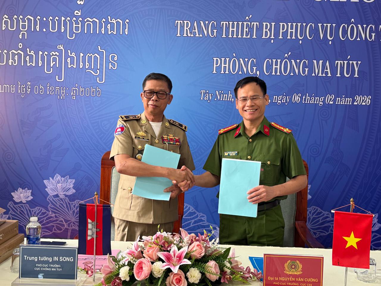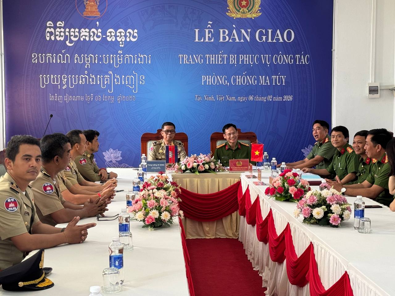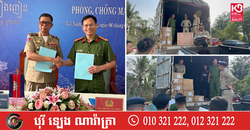 (ស្វាយរៀង)៖ ប្រតិភូមន្ទីរប្រឆាំងគ្រឿងញៀន នៃអគ្គស្នងការដ្ឋាននគរបាលជាតិកម្ពុជា ដឹកនាំដោយលកឧត្តមសេនីយ៍ ទោ អ៉ិន សុង នាយករងមន្ទីរប្រឆាំងគ្រឿងញៀន នៅព្រឹកថ្ងៃទី០៦ ខែកុម្ភៈ ឆ្នាំ២០២៦នេះ បានចូលរួមក្នុងពិធីប្រគល់-ទទួលឧបករណ៍ សម្ភារៈ បម្រើការងារប្រយុទ្ធ ប្រឆាំងគ្រឿងញៀន ពីនាយកដ្ឋានតម្រួតស៊ើបអង្កេតបទមើលគ្រឿងញៀន នៃក្រសួងនគរបាល វៀតណាម ដែលដឹកនាំតំណាងដោយវរសេនីយ៍ឯក ង្វៀង វ៉ាន់គ្រឿង អនុប្រធាននាយកដ្ឋានស៊ើបអង្កេតបទល្មើសគ្រឿងញៀន។