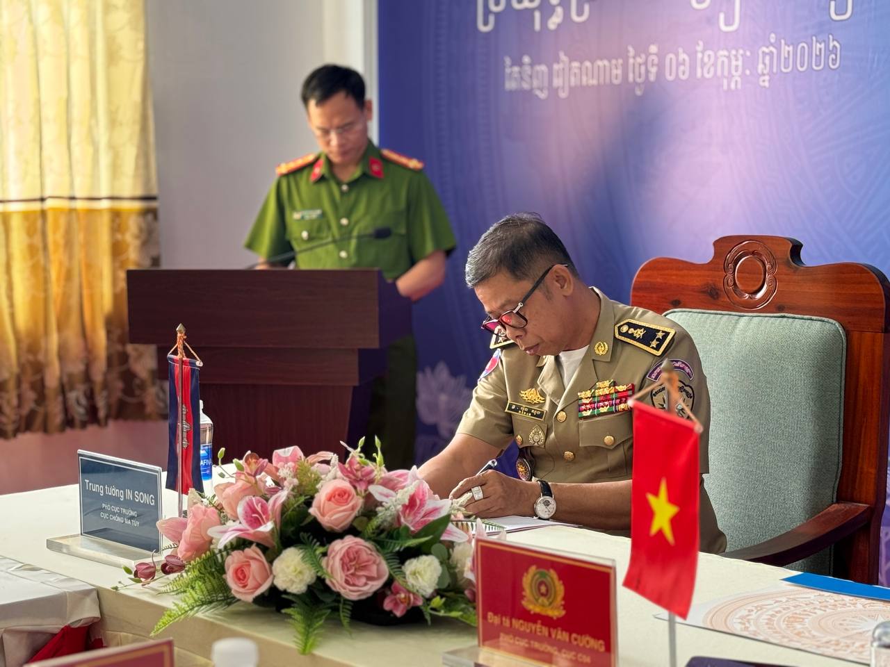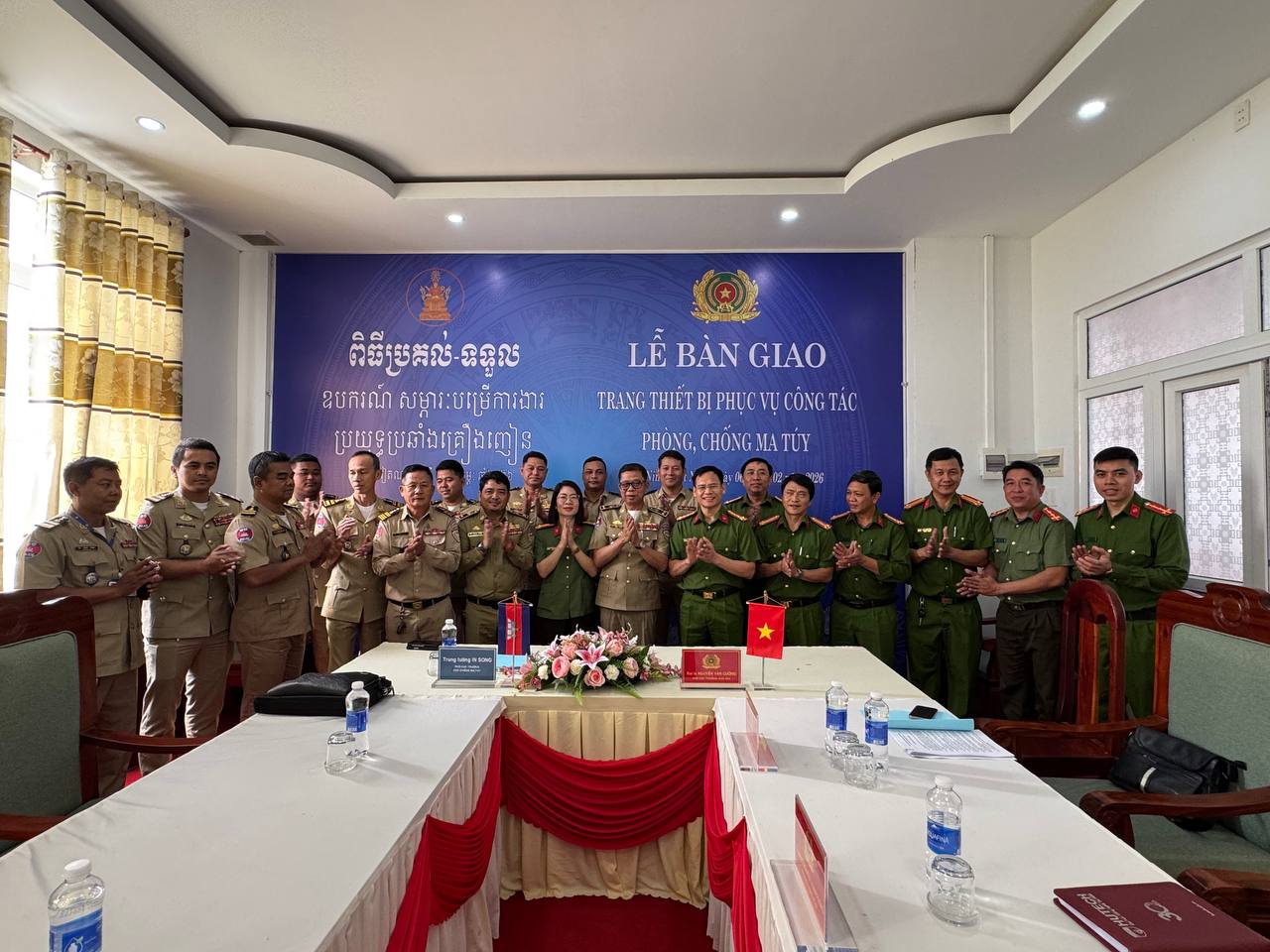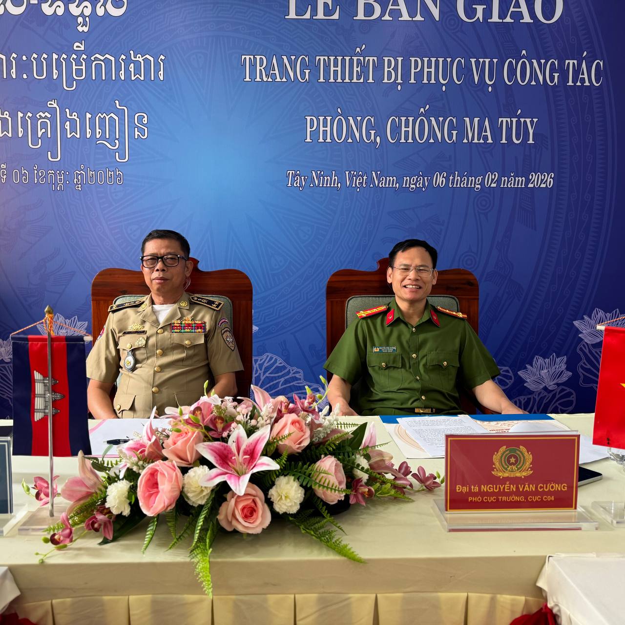 (ស្វាយរៀង)៖ ប្រតិភូមន្ទីរប្រឆាំងគ្រឿងញៀន នៃអគ្គស្នងការដ្ឋាននគរបាលជាតិកម្ពុជា ដឹកនាំដោយលកឧត្តមសេនីយ៍ ទោ អ៉ិន សុង នាយករងមន្ទីរប្រឆាំងគ្រឿងញៀន នៅព្រឹកថ្ងៃទី០៦ ខែកុម្ភៈ ឆ្នាំ២០២៦នេះ បានចូលរួមក្នុងពិធីប្រគល់-ទទួលឧបករណ៍ សម្ភារៈ បម្រើការងារប្រយុទ្ធ ប្រឆាំងគ្រឿងញៀន ពីនាយកដ្ឋានតម្រួតស៊ើបអង្កេតបទមើលគ្រឿងញៀន នៃក្រសួងនគរបាល វៀតណាម ដែលដឹកនាំតំណាងដោយវរសេនីយ៍ឯក ង្វៀង វ៉ាន់គ្រឿង អនុប្រធាននាយកដ្ឋានស៊ើបអង្កេតបទល្មើសគ្រឿងញៀន។