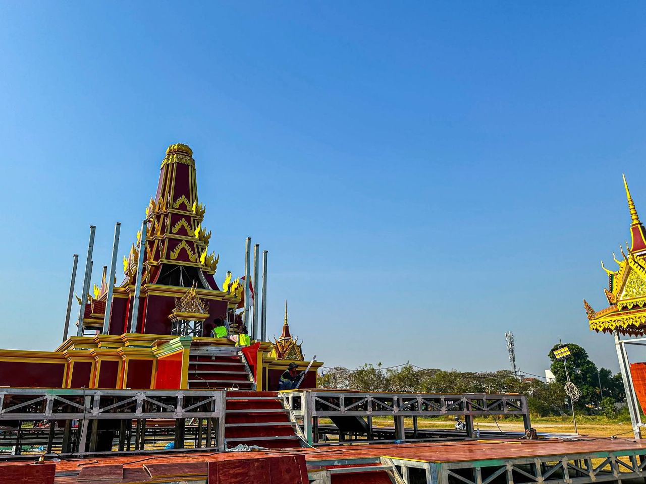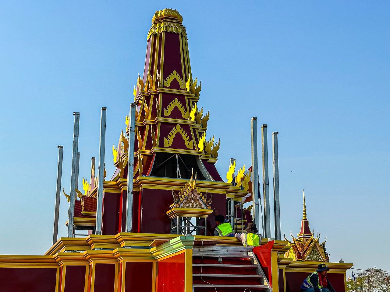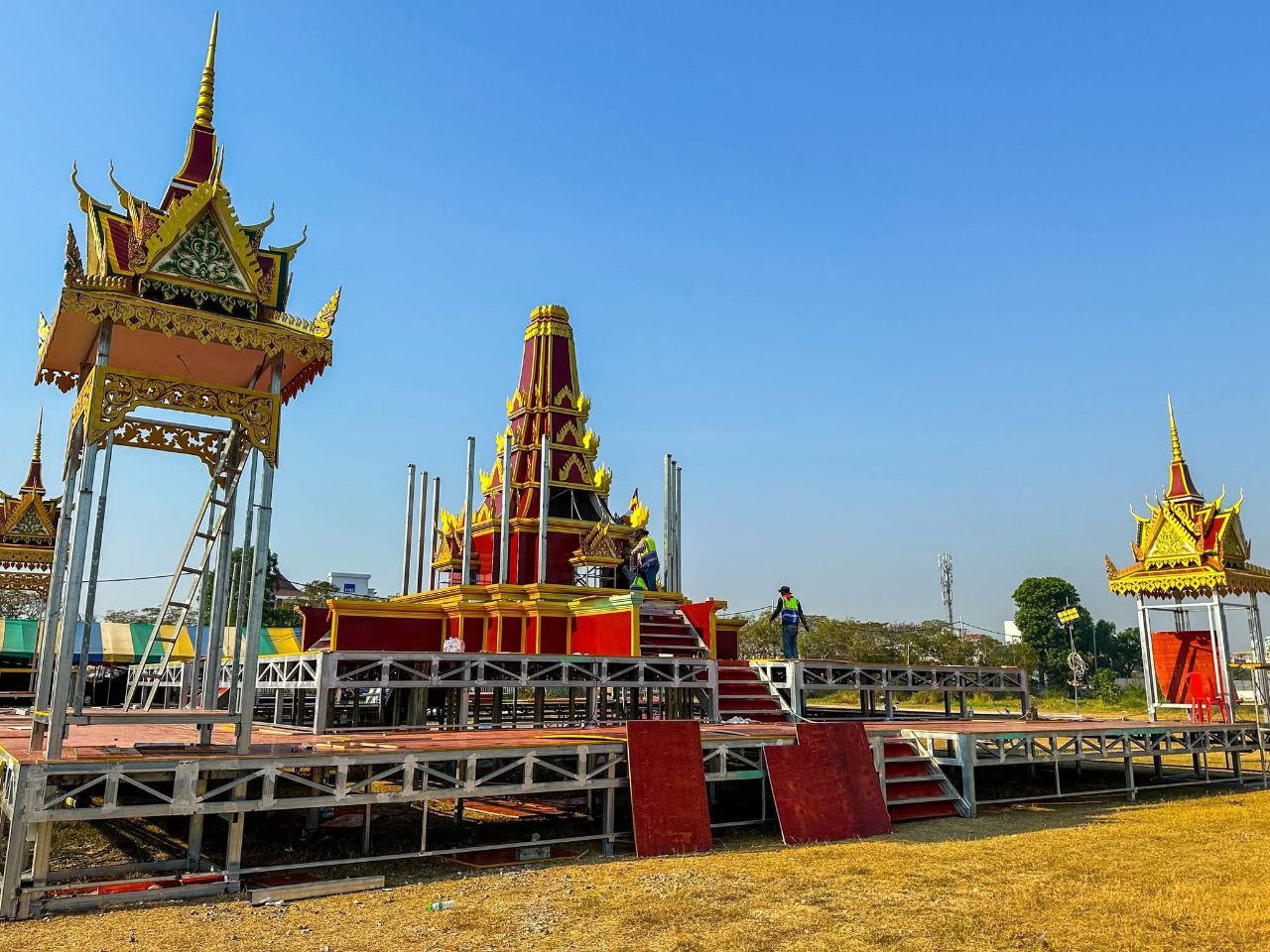 (បាត់ដំបង)៖ ក្រុមការងារខេត្តបាត់ដំបង រៀបចំសាងសង់វាលព្រះមេរុដែលនឹងត្រូវបូជាព្រះសព ព្រះឥន្ទមុនី អ៊ុក មុត ព្រះរាជាគណៈថ្នាក់ចត្វា ព្រះសង្ឃកិច្ចកោស ល្យព្រះមេគណខេត្ត ព្រះឧបជ្ឈាយ៍ខេត្ត និងជាព្រះនាយកពុទ្ធិកវិទ្យាល័យ អ៊ឹង ធួង ខេត្តបាត់ដំបងដែល បានទទួលអនិច្ចកម្ម កាលពីថ្ងៃសៅរ៍ ៥រោច ខែអាសាឍ ឆ្នាំម្សាញ់ សប្តស័ក ព.ស.២៥៦៩ ត្រូវនឹងថ្ងៃទី១៩ ខែកក្កដា ឆ្នាំ២០២៥ វេលាម៉ោង១៩៖០០នាទី ក្នុងព្រះជន្មាយុ៨៨ព្រះវស្សា ដោយព្រះជរាពាធ នៅឯវត្តពោធិ៍វាល សង្កាត់រតនៈ ក្រុងបាត់ដំបង ខេត្តបាត់ដំបង។