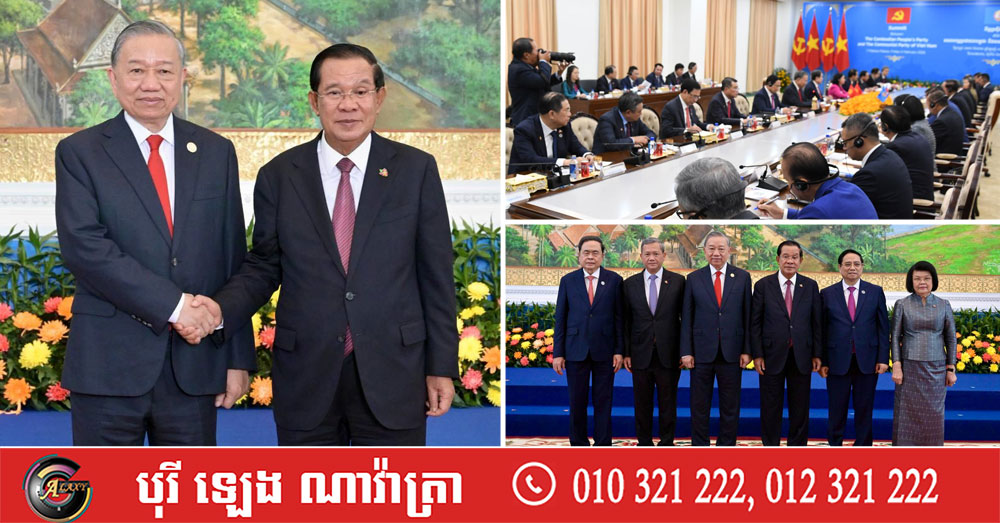 (ភ្នំពេញ)៖ សម្តេចតេជោ ហ៊ុន សែន ប្រធានគណបក្សប្រជាជនកម្ពុជា និងលោក តូ ឡឹម អគ្គលេខាធិការបក្សកុម្មុយនិស្តវៀតណាម នៅព្រឹកថ្ងៃទី៦ ខែកុម្ភៈ ឆ្នាំ២០២៦នេះ បានប្តេជ្ញាចិត្តថែរក្សា និងការពារសន្តិសុខនៅតាមព្រំដែនរវាងប្រទេសទាំងពីរ រួមទាំងខិតខំជំរុញនូវពាណិជ្ជកម្ម និងសេដ្ឋកិច្ចនៃប្រទេសទាំងពីរឲ្យកាន់តែរីកចម្រើន ពោលគឺធ្វើយ៉ាងណាឲ្យឡើងដល់ ២០ពាន់លានដុល្លារអាមេរិក។