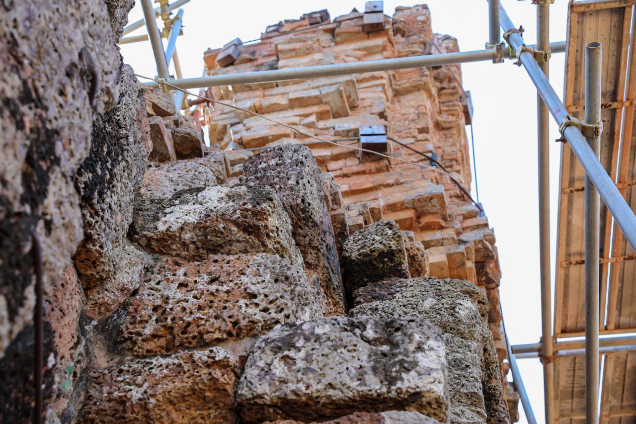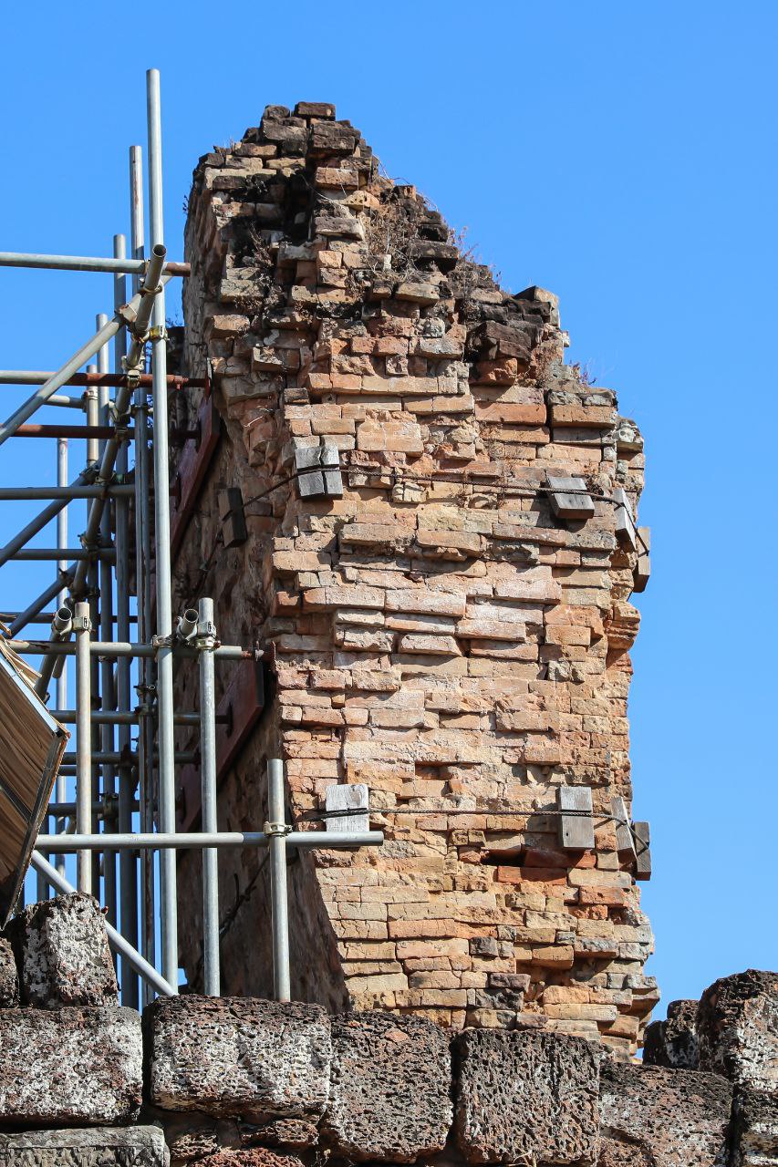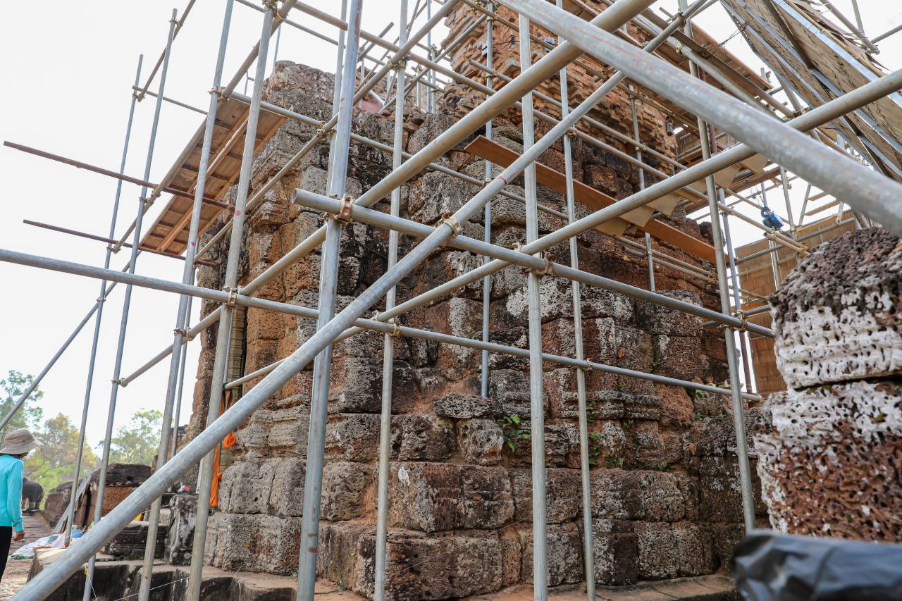 ក្នុងនោះ ក្រុមការងារផ្តោតសំខាន់ទៅលើការជួសជុលគ្រឹះ និងជញ្ជាំងថ្មបាយក្រៀម ដែលព័ទ្ធជុំវិញជារចនាសម្ពន្ធសម្រាប់ទ្រទ្រង់ដល់តួប៉មឥដ្ឋផ្នែកខាងលើ ដោយធ្វើការសម្អាតយកកំណកដីចេញពីតាមចន្លោះថ្នេរថ្ម និងកន្លែងប្រេះ រួចបិតបាយអឡើងវិញ ដើម្បីធានាមិនឱ្យទឹកជ្រាបចូល។