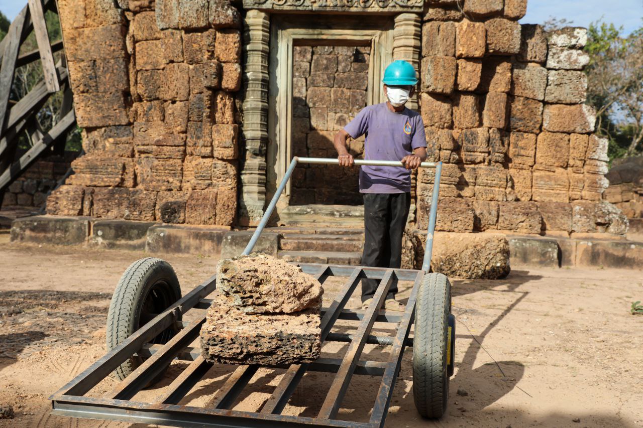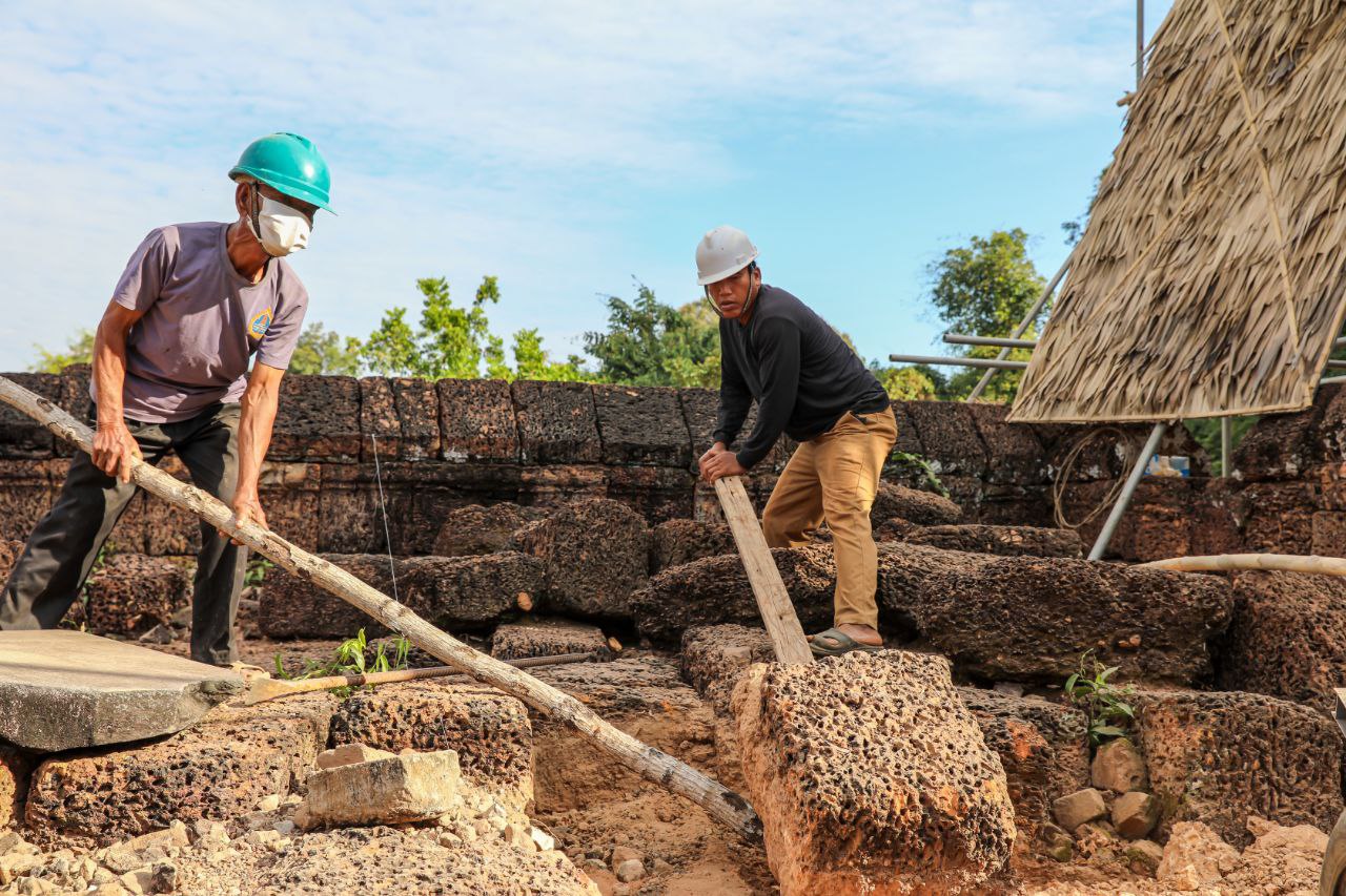 (សៀមរាប)៖ ក្រុមការងារនៃនាយកដ្ឋានអភិរក្សប្រាសាទ និងបុរាណវិទ្យា នៃអាជ្ញាធរជាតិអប្សរា កំពុងជួសជុលខ្លោងទ្វារខាងជើង នៅប្រាសាទមេបុណ្យខាងកើត ដែលបានរងការខូចខាតទ្រុឌទ្រោមដោយកត្តាជាច្រើន។