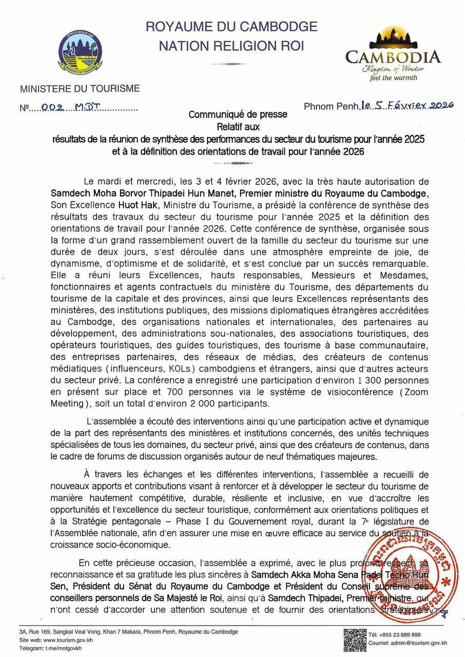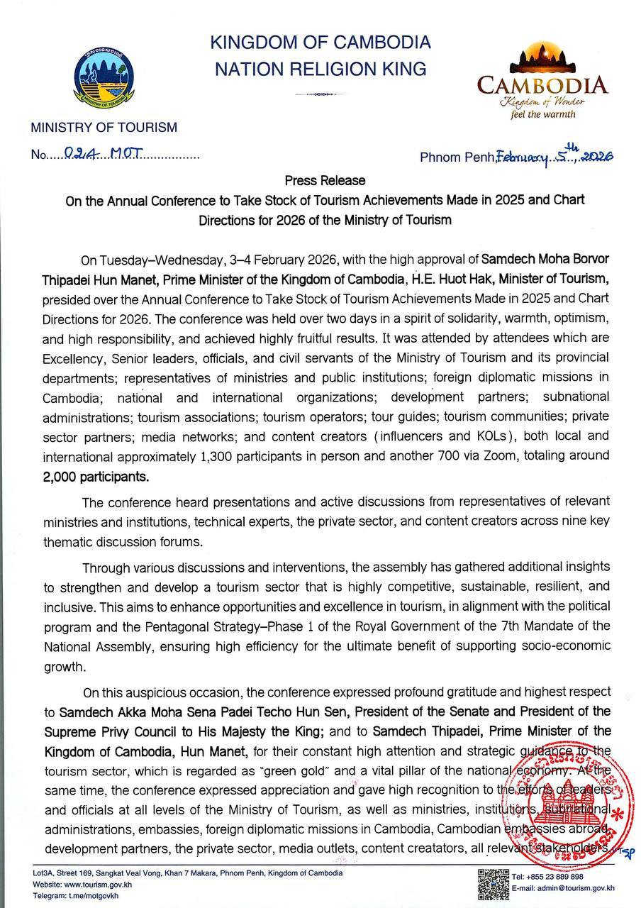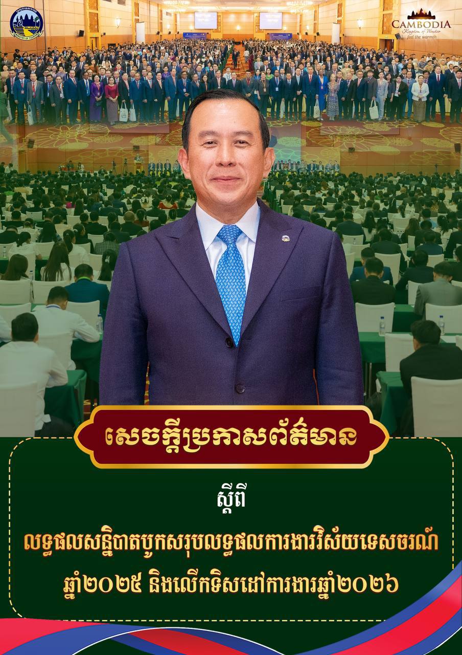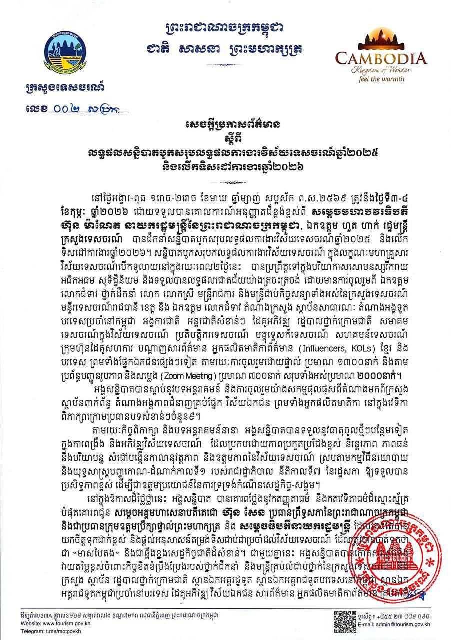(ភ្នំពេញ)៖ ក្រសួងទេសចរណ៍ នៅថ្ងៃទី៦ ខែកុម្ភៈ ឆ្នាំ២០២៦នេះ បានចេញសេចក្តីប្រកាសព័ត៌មាន ស្តីពីលទ្ធផលសន្និបាតបូកសរុបលទ្ធផលការងារវិស័យទេសចរណ៍ឆ្នាំ២០២៥ និងលើកទិសដៅការងារឆ្នាំ២០២៦ ដែលប្រព្រឹត្តទៅរយៈពេល២ថ្ងៃ ចាប់ពីថ្ងៃទី៣-៤ ខែកុម្ភៈ ឆ្នាំ២០២៦។