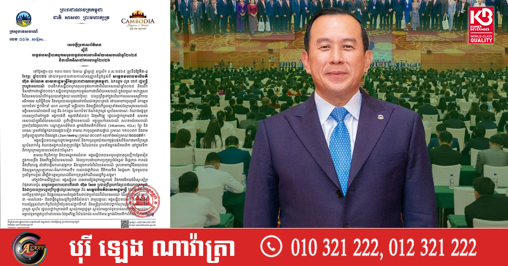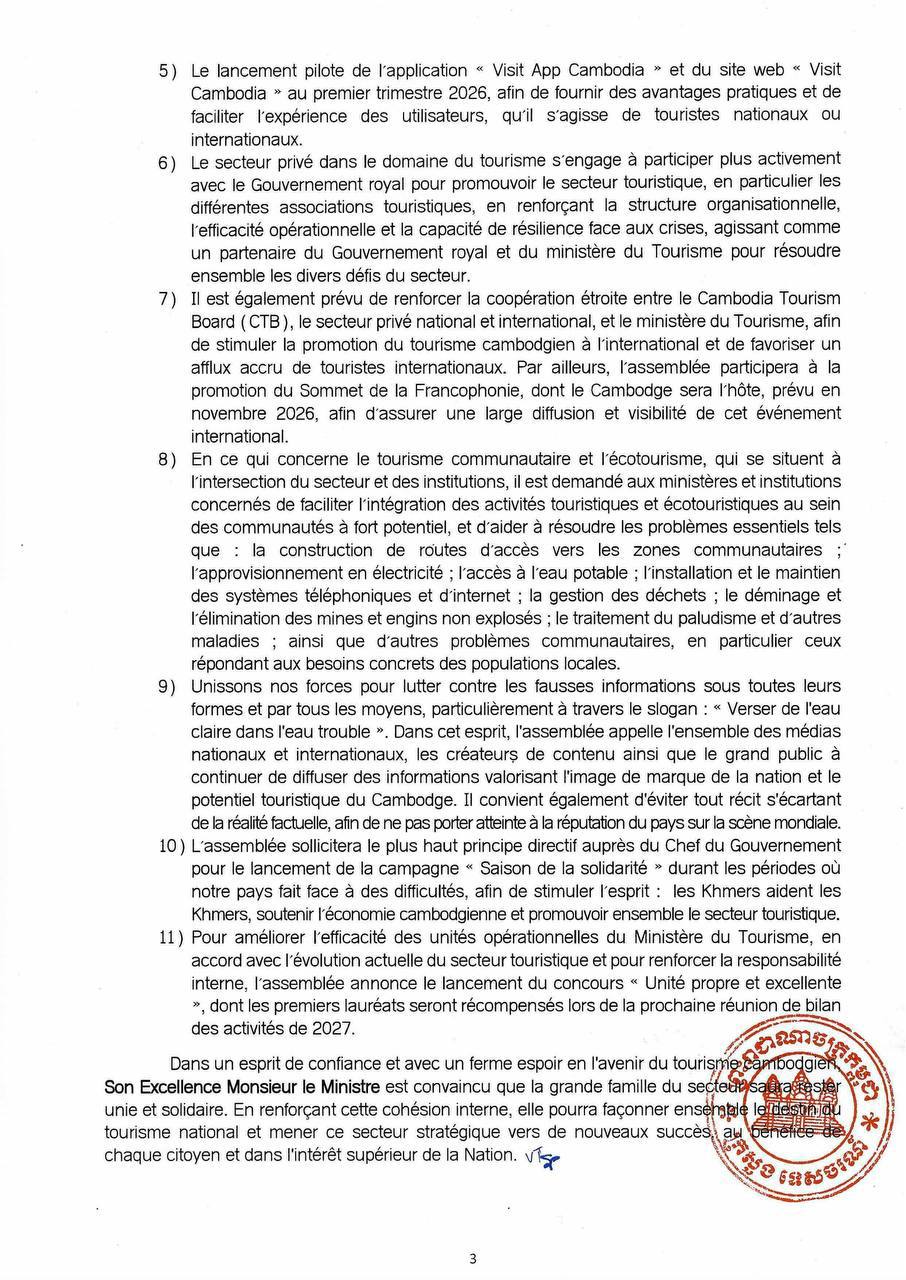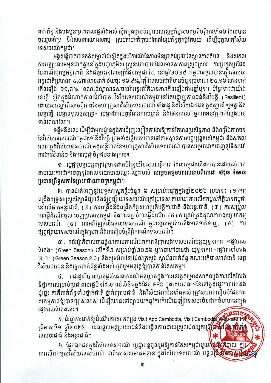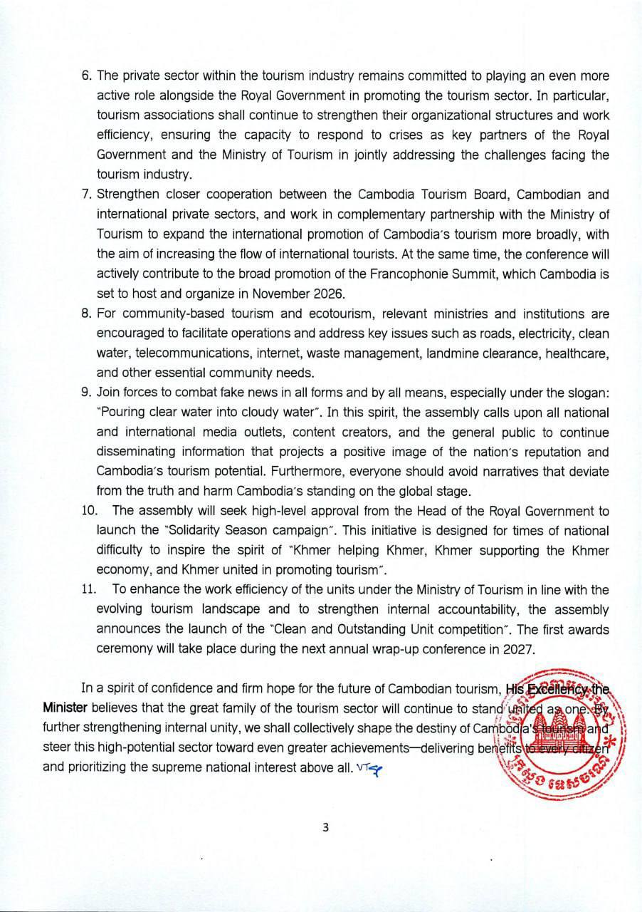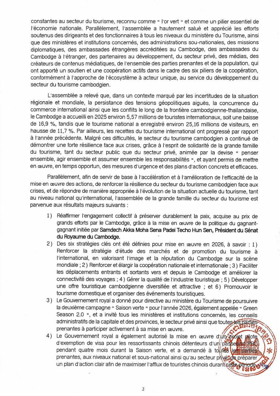 (ភ្នំពេញ)៖ ក្រសួងទេសចរណ៍ នៅថ្ងៃទី៦ ខែកុម្ភៈ ឆ្នាំ២០២៦នេះ បានចេញសេចក្តីប្រកាសព័ត៌មាន ស្តីពីលទ្ធផលសន្និបាតបូកសរុបលទ្ធផលការងារវិស័យទេសចរណ៍ឆ្នាំ២០២៥ និងលើកទិសដៅការងារឆ្នាំ២០២៦ ដែលប្រព្រឹត្តទៅរយៈពេល២ថ្ងៃ ចាប់ពីថ្ងៃទី៣-៤ ខែកុម្ភៈ ឆ្នាំ២០២៦។