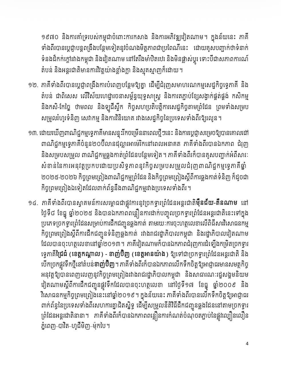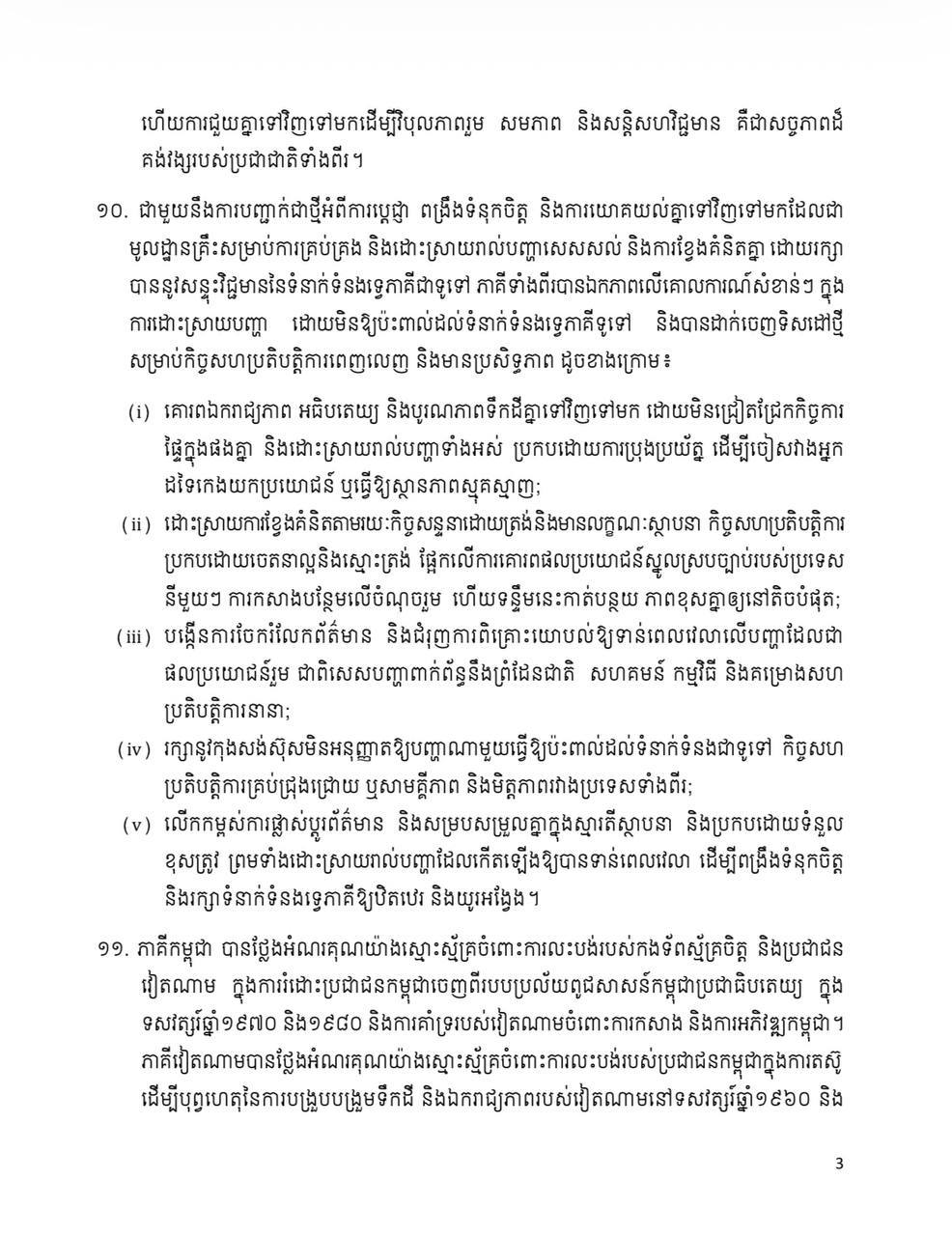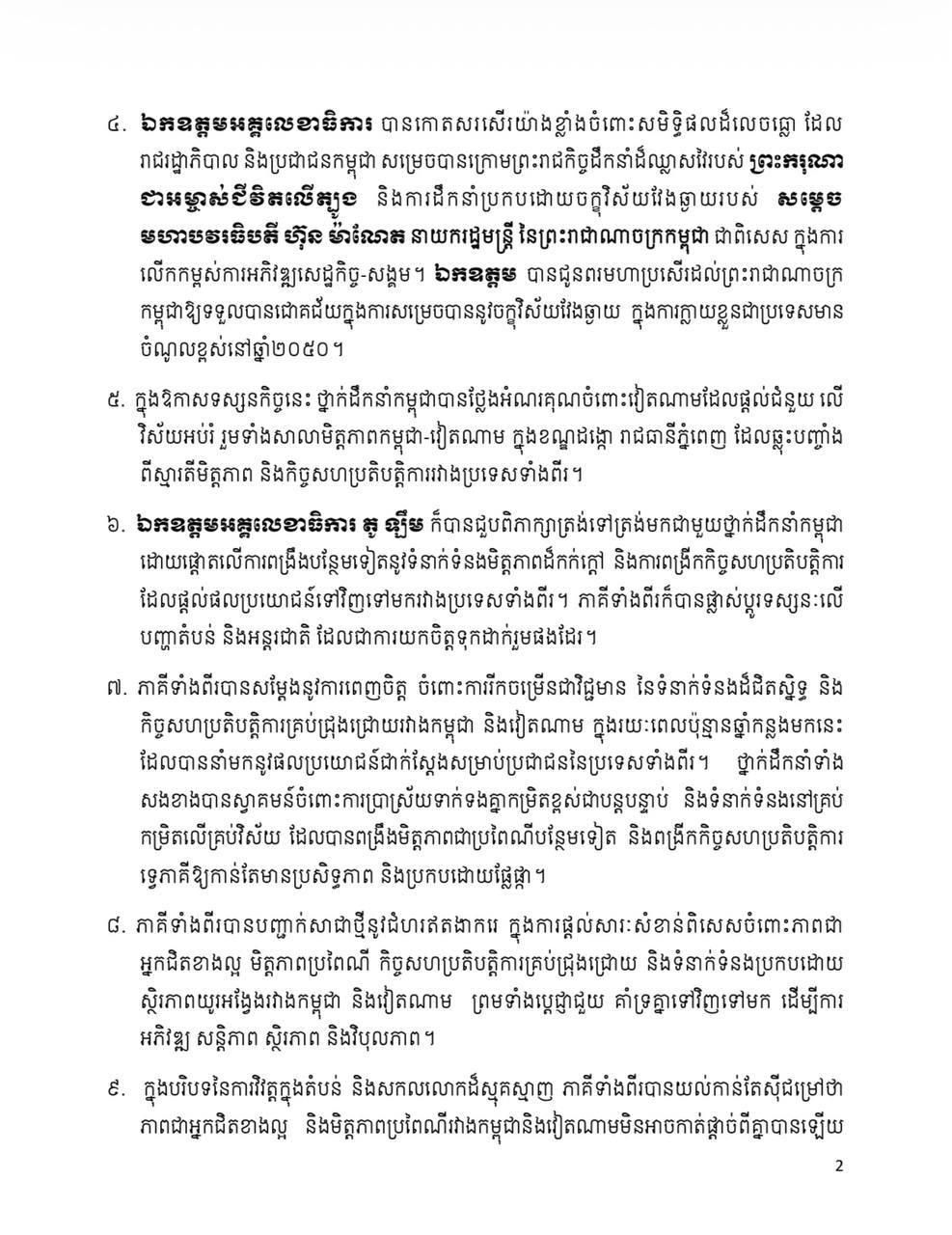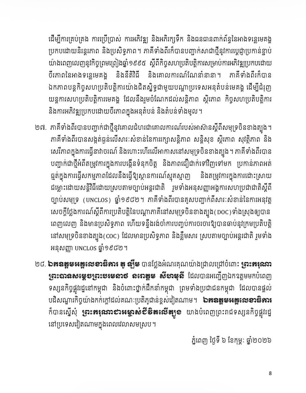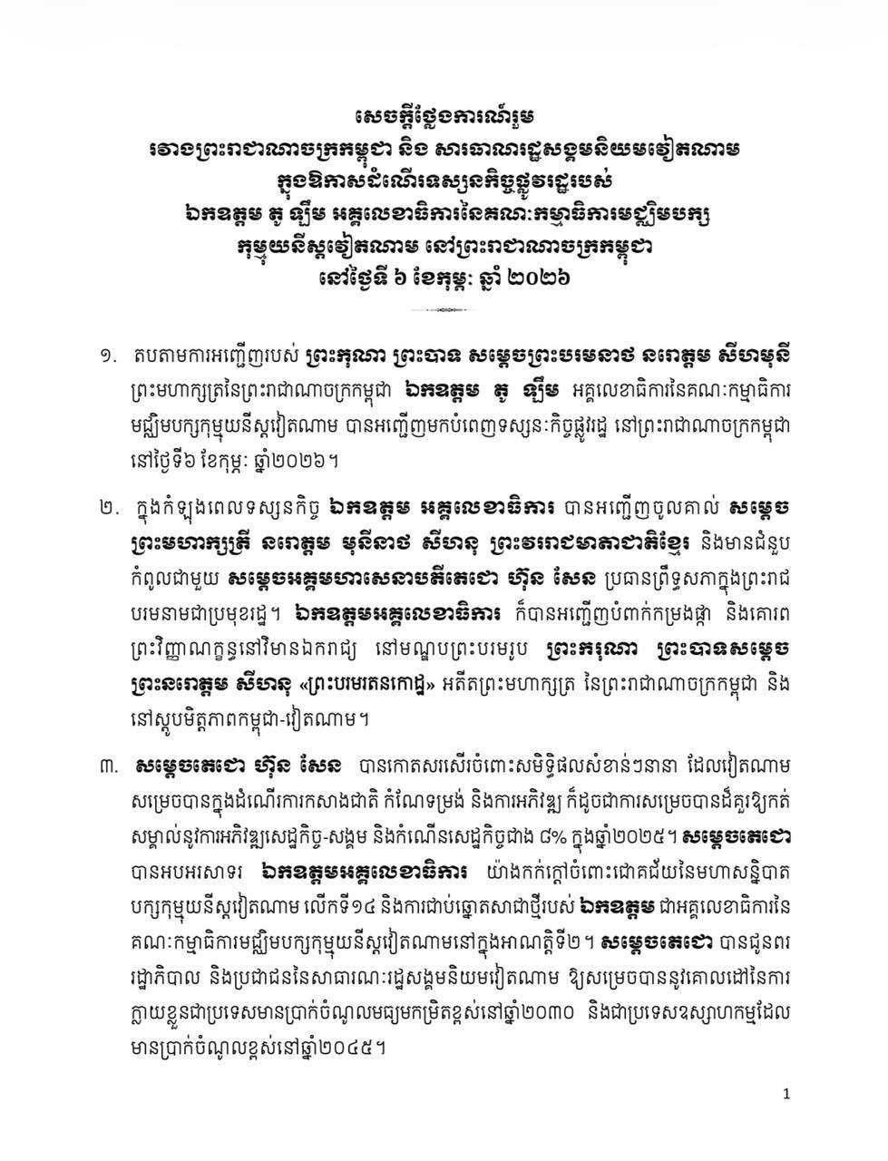 (ភ្នំពេញ)៖ ក្រោយបញ្ចប់ទស្សនកិច្ចផ្លូវរដ្ឋ កម្ពុជា-វៀតណាម បានចេញសេចក្តីថ្លែងការណ៍រួម រវាងកម្ពុជា និង សាធារណរដ្ឋសង្គមនិយមវៀតណាម ក្នុងឱកាសដំណើរទស្សនកិច្ចផ្លូវរដ្ឋរបស់ លោក តូ ឡឹម អគ្គលេខាធិការនៃគណៈកម្មាធិការមជ្ឈិមបក្សកុម្មុយនីស្តវៀតណាម នៅព្រះរាជាណាចក្រកម្ពុជា នៅថ្ងៃទី ៦ ខែកុម្ភៈ ឆ្នាំ ២០២៦នេះ។