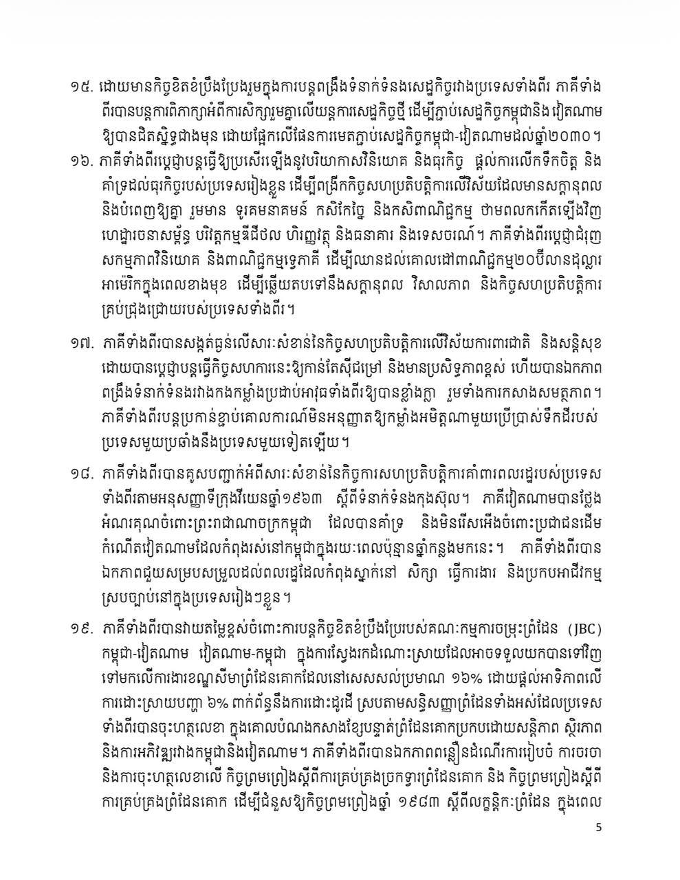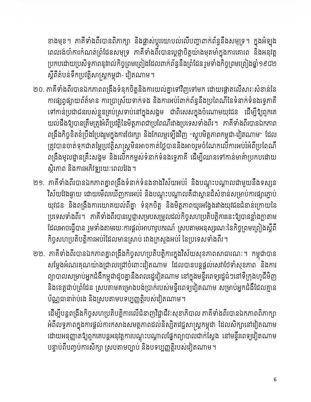 សេចក្តីថ្លែងការណ៍រួមកម្ពុជា-វៀតណាម ក្នុងឱកាសដំណើរទស្សនកិច្ចផ្លូវរដ្ឋរបស់ លោក តូ ឡឹម នៅកម្ពុជា នៅថ្ងៃទី ៦ ខែកុម្ភៈ
