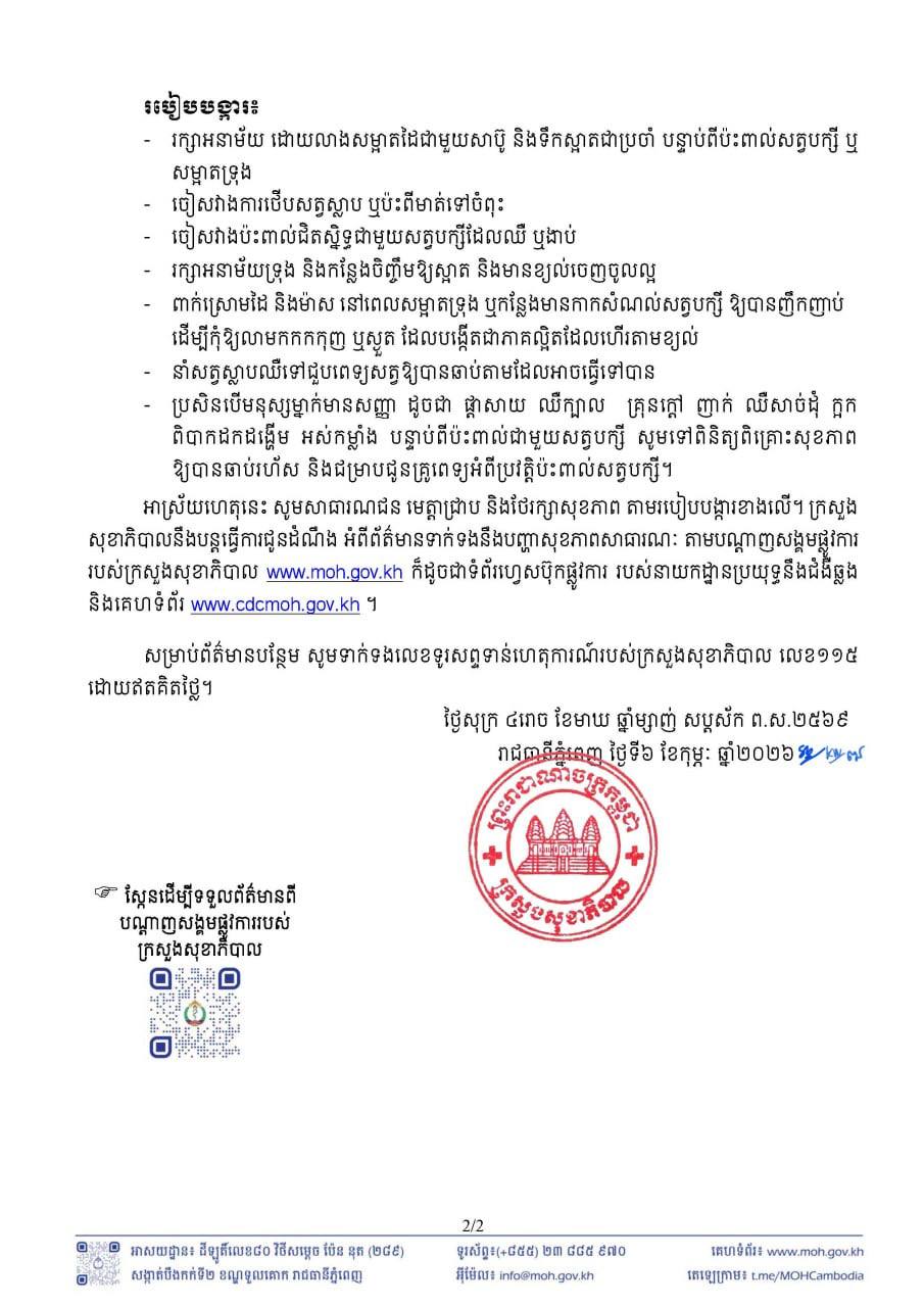 អាស្រ័យហេតុនេះ សូមសាធារណជន មេត្តាជ្រាប និងថែរក្សាសុខភាព តាមរបៀបបង្ការខាងលើ។ ក្រសួងសុខាភិបាលនឹងបន្តធ្វើការជូនដំណឹង អំពីព័ត៌មានទាក់ទងនឹងបញ្ហាសុខភាពសាធារណៈ តាមបណ្ដាញសង្គមផ្លូវការ របស់ក្រសួងសុខាភិបាល www.moh.gov.kh ក៏ដូចជាទំព័រហ្វេសប៊ុកផ្លូវការ របស់នាយកដ្ឋានប្រយុទ្ធនឹងជំងឺឆ្លង និងគេហទំព័រ www.cdcmoh.gov.kh ។ សម្រាប់ព័ត៌មានបន្ថែម សូមទាក់ទងលេខទូរសព្ទទាន់ហេតុការណ៍របស់ក្រសួងសុខាភិបាល លេខ១១៥ ដោយឥតគិតថ្លៃ៕