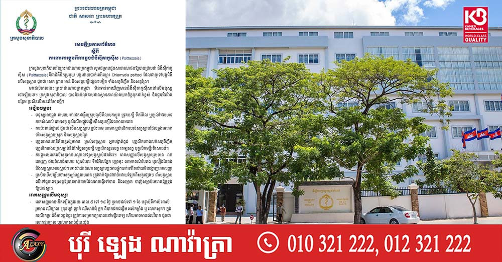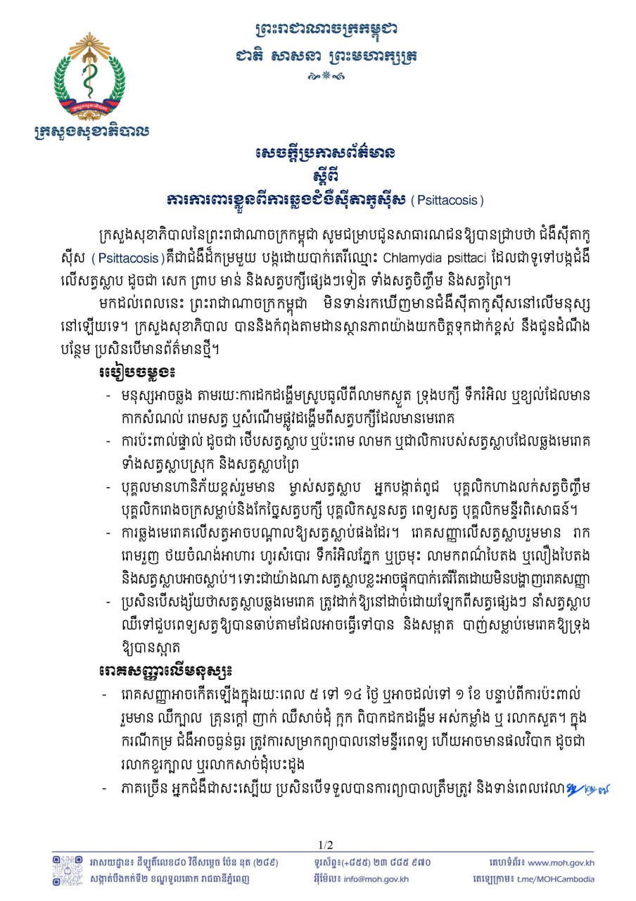 (ភ្នំពេញ)៖ ក្រសួងសុខាភិបាល បានចេញសេចក្តីប្រកាសព័ត៌មាន ស្តីពី ការការពារខ្លួនពីការឆ្លងជំងឺស៊ីតាកូស៊ីស (Psittacosis) ដែលជាជំងឺដ៏កម្រមួយ បង្កដោយបាក់តេរីឈ្មោះ Chlamydia psittaci ដែលជាទូទៅបង្កជំងឺលើសត្វស្លាប ដូចជា សេក ព្រាប មាន់ និងសត្វបក្សីផ្សេងៗទៀត ទាំងសត្វចិញ្ចឹម និងសត្វព្រៃ។
