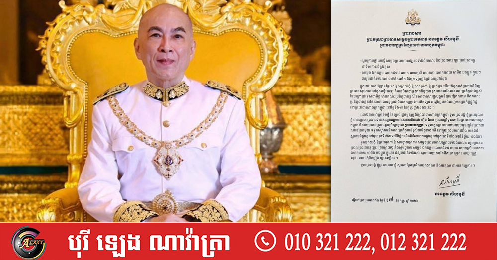 ព្រះរាជសារ៖ ព្រះមហាក្សត្រ ប្រឈួនកំពុងគង់ប្រថាប់ពិនិត្យ សុខភាពនៅមន្ទីរពេទ្យ ទ្រង់ប្រគល់ភារកិច្ចជូន សម្តេចតេជោ ហ៊ុន សែន ក្នុងព្រះបរមនាមជាប្រមុខរដ្ឋ ទទួលស្វាគមន៍គណៈប្រតិភូជាន់ខ្ពស់ជាមិត្ត នៅក្នុងព្រះបរមរាជវាំង មានពិធីស្វាគមន៍ផ្លូវរដ្ឋ និងពិធីសវនាការផ្លូវរដ្ឋនៅក្នុងព្រះទីនាំងទេវាវិនិច្ឆ័យ (Video inside)
