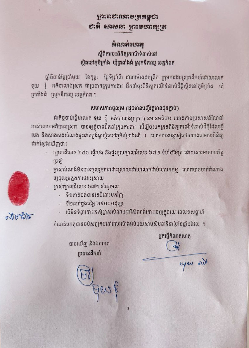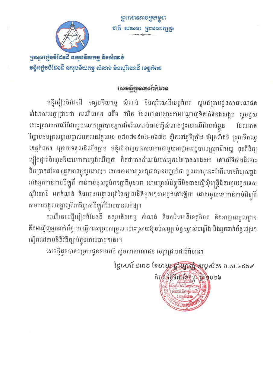 ក្នុងសេចក្ដីប្រកាសព័ត៌មានរបស់មន្ទីររៀបចំដែនដីខេត្តកំពត នៅថ្ងៃទី៧ ខែកុម្ភៈ ឆ្នាំ២០២៦នេះ បានបញ្ជាក់ថា ក្រោយទទួលដំណឹងភ្លាម មន្ទីរជំនាញបានសហការជាមួយអាជ្ញាធររដ្ឋបាលស្រុកទឹកឈូ ចុះពិនិត្យផ្ទៀងផ្ទាត់ចំណុចនិយាមកាតាមប្លង់ឃើញថា ពិតជាមានសំណង់របស់អ្នកដទៃបានសាងសង់ នៅលើទីតាំងដីនោះពិតប្រាកដមែន (ដូចមានក្នុងរូបភាព)។