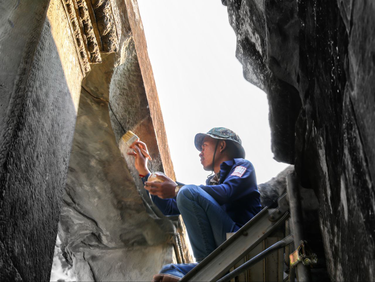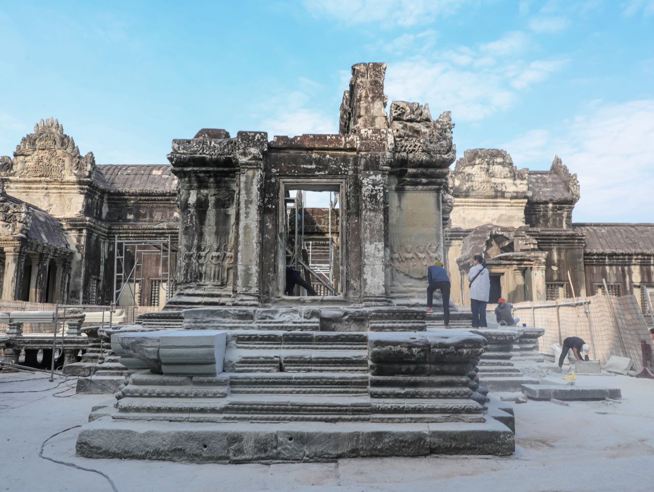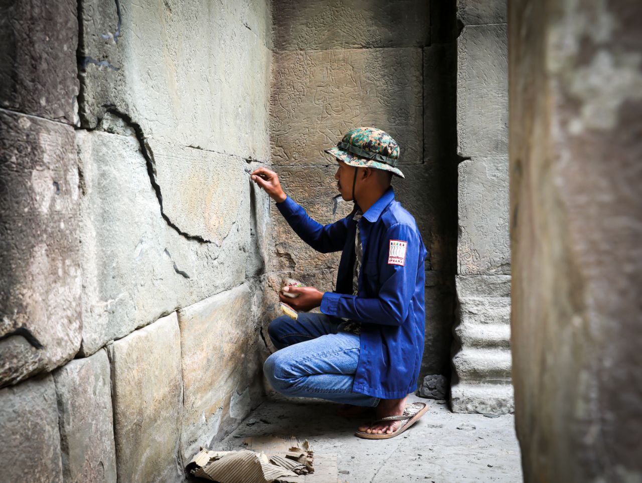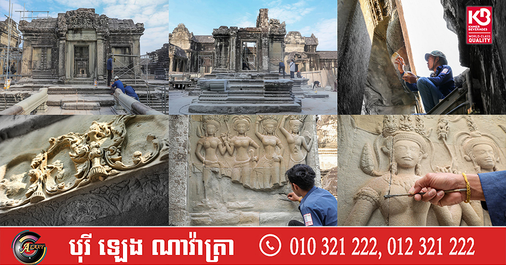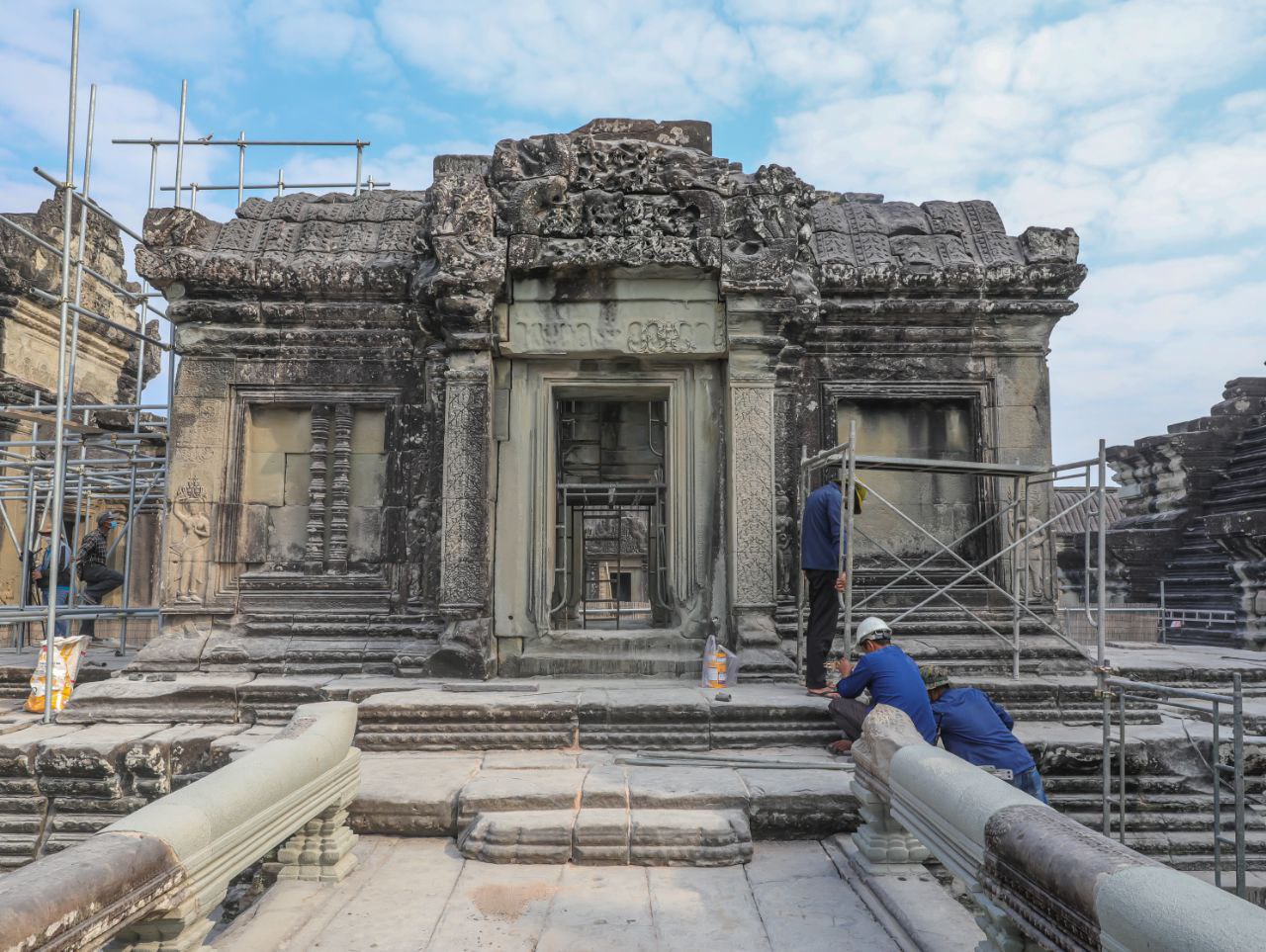 (សៀមរាប)៖ អាជ្ញាធរជាតិអប្សរា តាមរយៈក្រុមអភិរក្សថ្ម នៃនាយកដ្ឋានអភិរក្សប្រាសាទ និងបុរាណវិទ្យា កំពុងជួសជុលពង្រឹងថ្ម នៅបណ្ណាល័យខាងជើង នៃជាន់ទី២ប្រាសាទអង្គរវត្ត ខណៈដែលថ្មទាំងនោះ មានការពុកផុយ ប្រេះបែក ដោយសារកត្តាធម្មជាតិ និងអាយុកាល។
