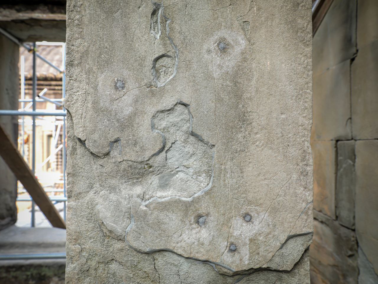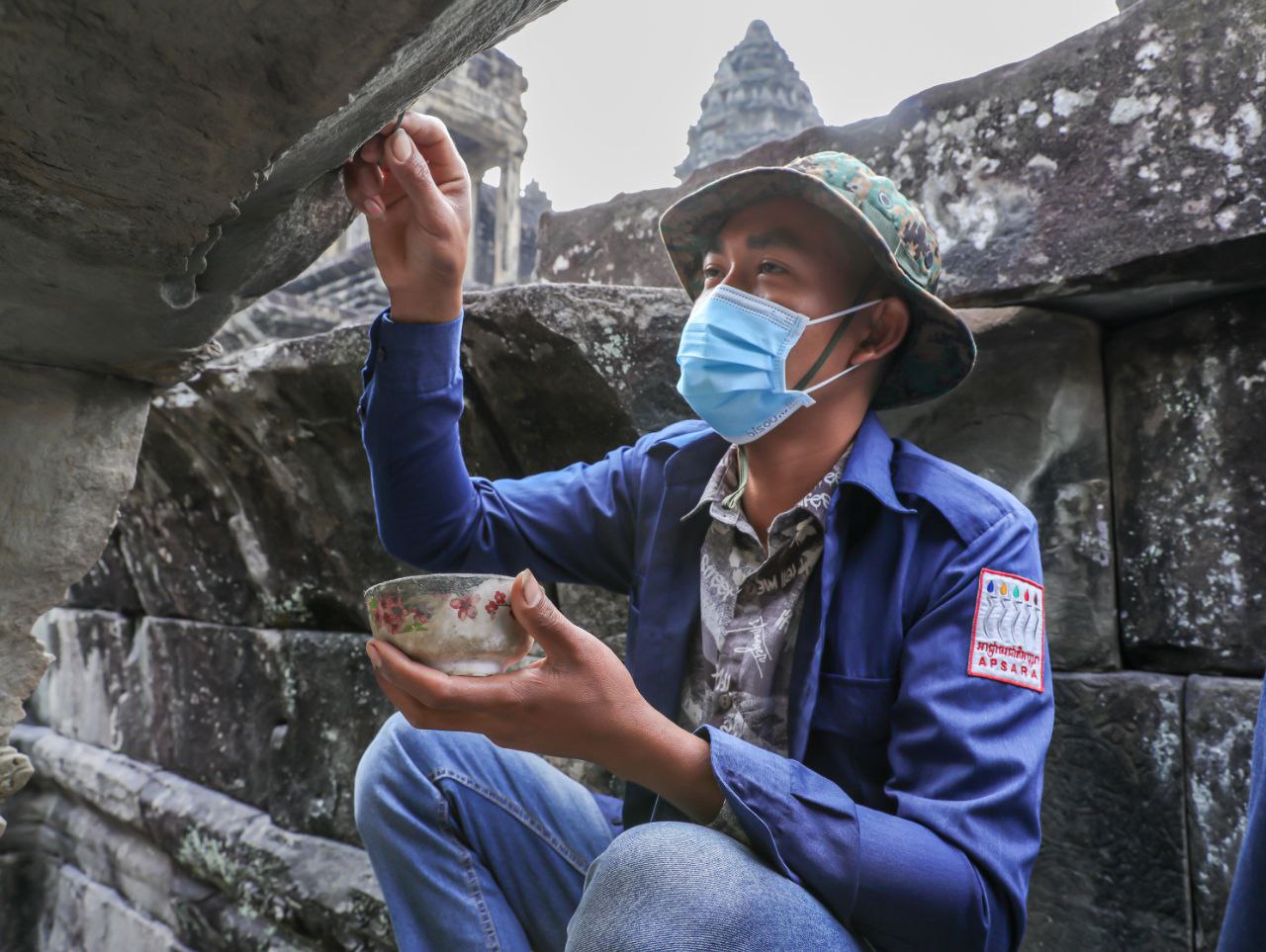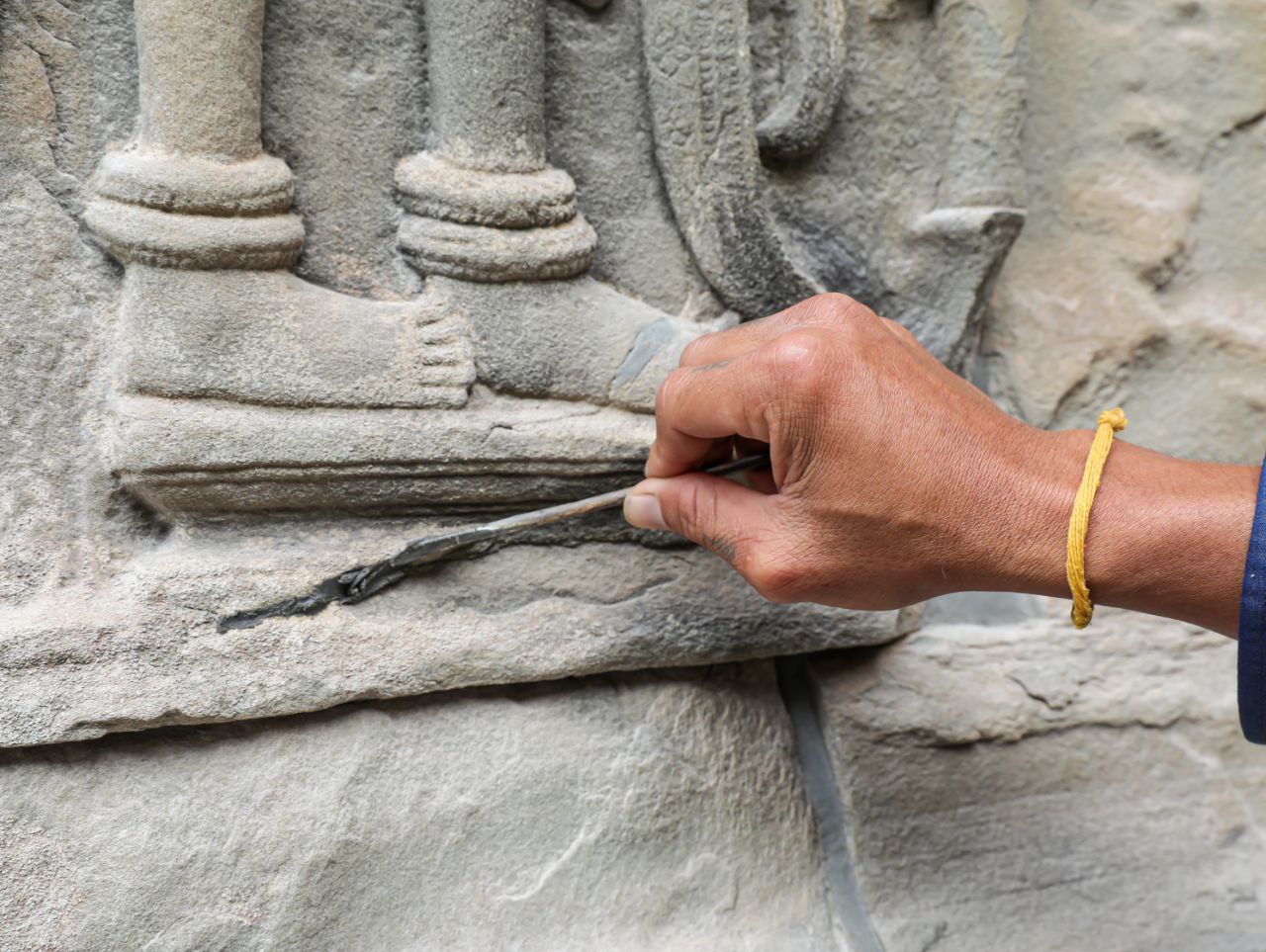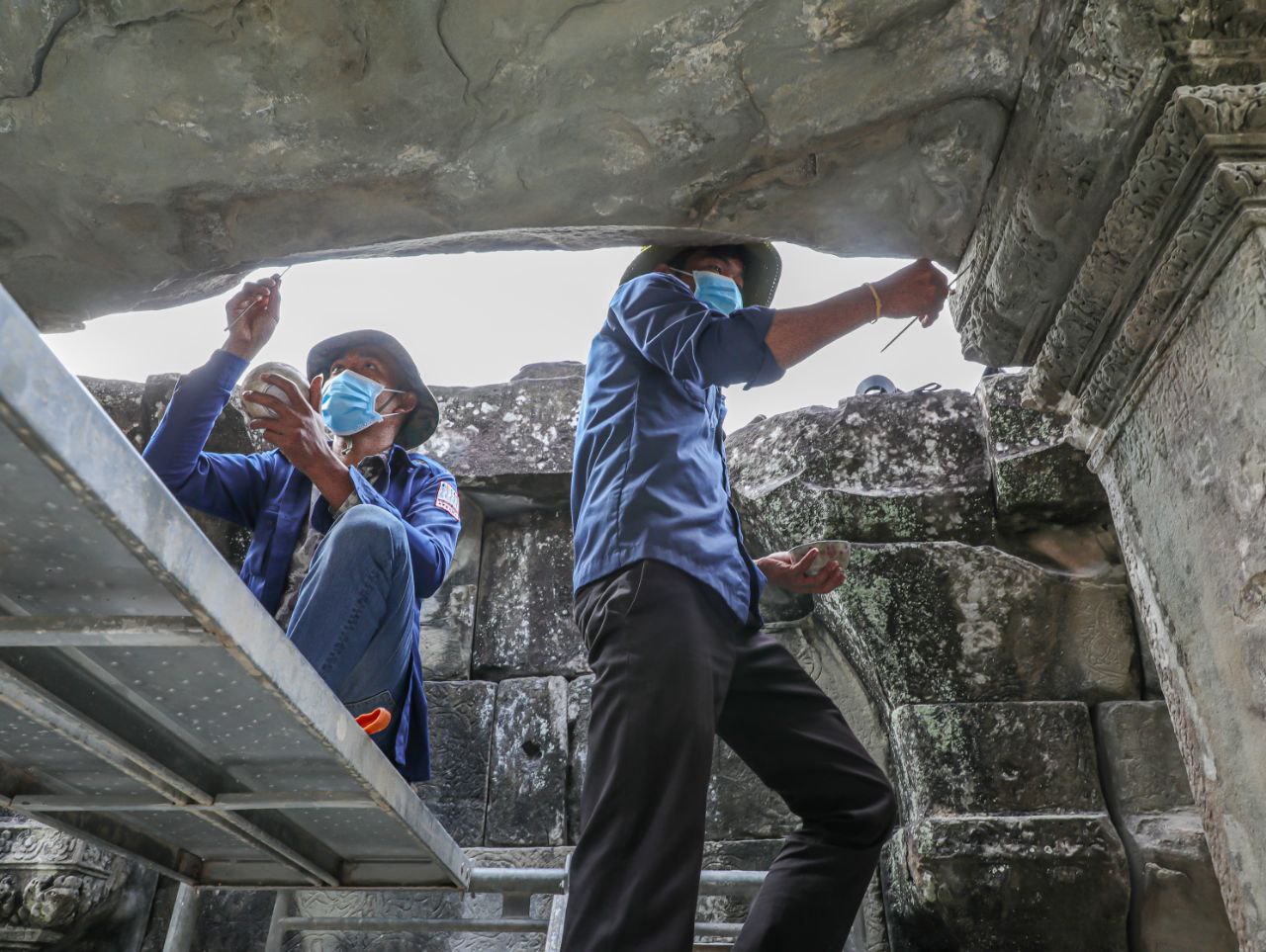 អ្នកជំនាញកំពុងព្យាបាលថ្មពុកផុយ នៅបណ្ណាល័យខាងជើងជាន់ទី២ ប្រាសាទអង្គរវត្ត