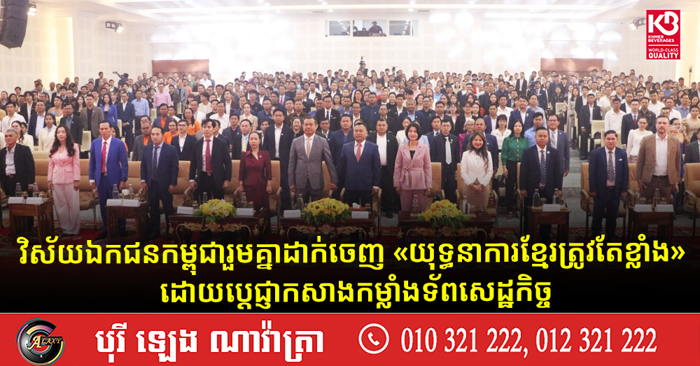 (ភ្នំពេញ)៖ ក្នុងបរិបទដែលពិភពលោក មានការប្រែប្រួលយ៉ាងឆាប់រហ័ស និងប្រកួតប្រជែងកាន់តែខ្លាំងនោះ វិស័យឯកជនកម្ពុជា បានរួមគ្នាដាក់ចេញ «យុទ្ធនាការខ្មែរត្រូវតែខ្លាំង» ជាមួយនឹងការប្តេជ្ញាចិត្តកសាង «កម្លាំងទ័ពសេដ្ឋកិច្ច» ដើម្បីជាការរួមចំណែកជួយដល់រាជរដ្ឋាភិបាល និងប្រទេសជាតិដែលកំពុងប្រឈមនឹងការឈ្លានពាន។