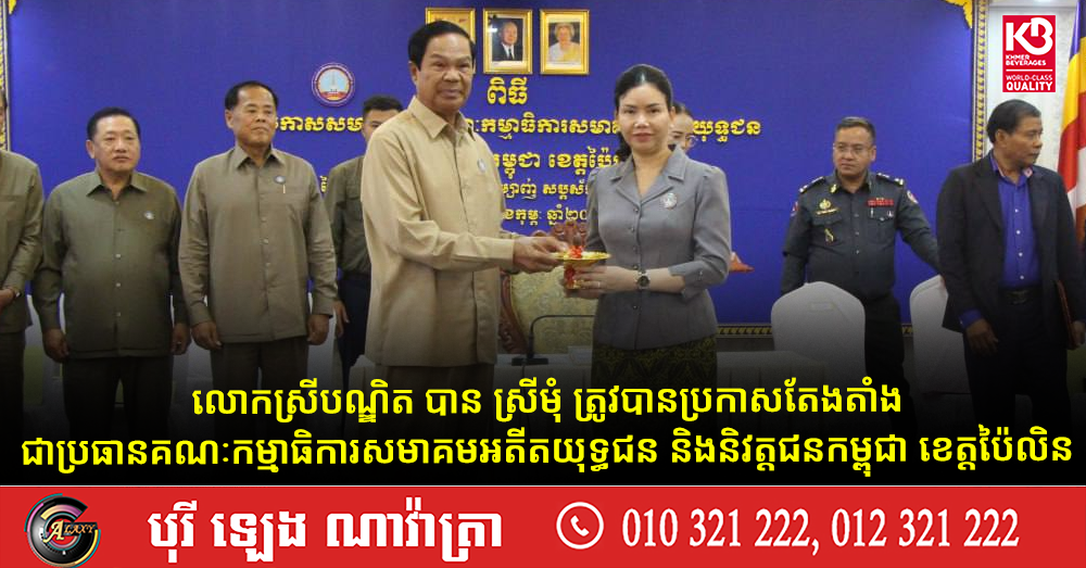 លោកស្រីបណ្ឌិត បាន ស្រីមុំ ត្រូវបានប្រកាសតែងតាំងជាប្រធានគណៈកម្មាធិការសមាគមអតីតយុទ្ធជន និងនិវត្តជនកម្ពុជា ខេត្តប៉ៃលិន