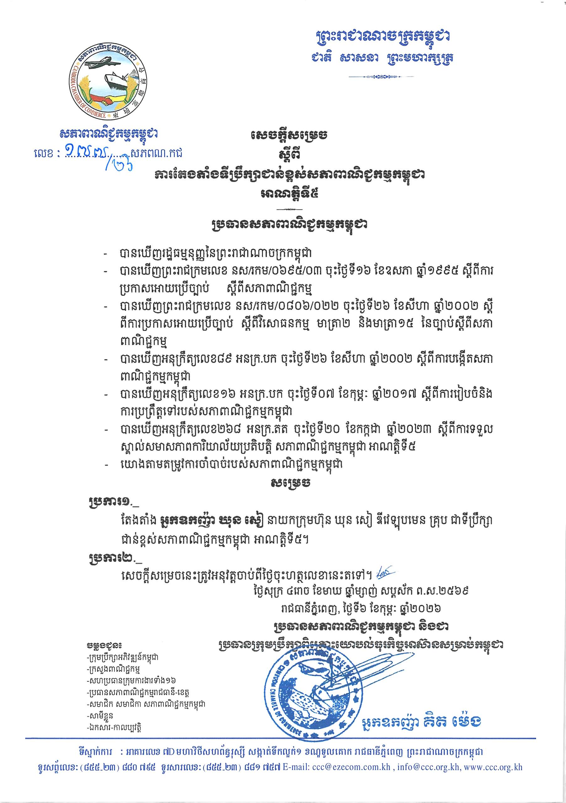 (ភ្នំពេញ)៖ អ្នកឧកញ៉ា គិត ម៉េង ប្រធានសភាពាណិជ្ជកម្មកម្ពុជា និងជាប្រធានក្រុមប្រឹក្សាពិគ្រោះយោបល់ធុរកិច្ចអាស៊ានសម្រាប់កម្ពុជា បានចេញសេចក្ដីសម្រេច តែងតាំងអ្នកឧកញ៉ា ឃុន សៀ នាយកក្រុមហ៊ុន ឃុន សៀ ឌីវេឡុបមេន គ្រុប ជាទីប្រឹក្សាជាន់ខ្ពស់សភាពាណិជ្ជកម្មកម្ពុជា អាណត្ដិទី៥៕
