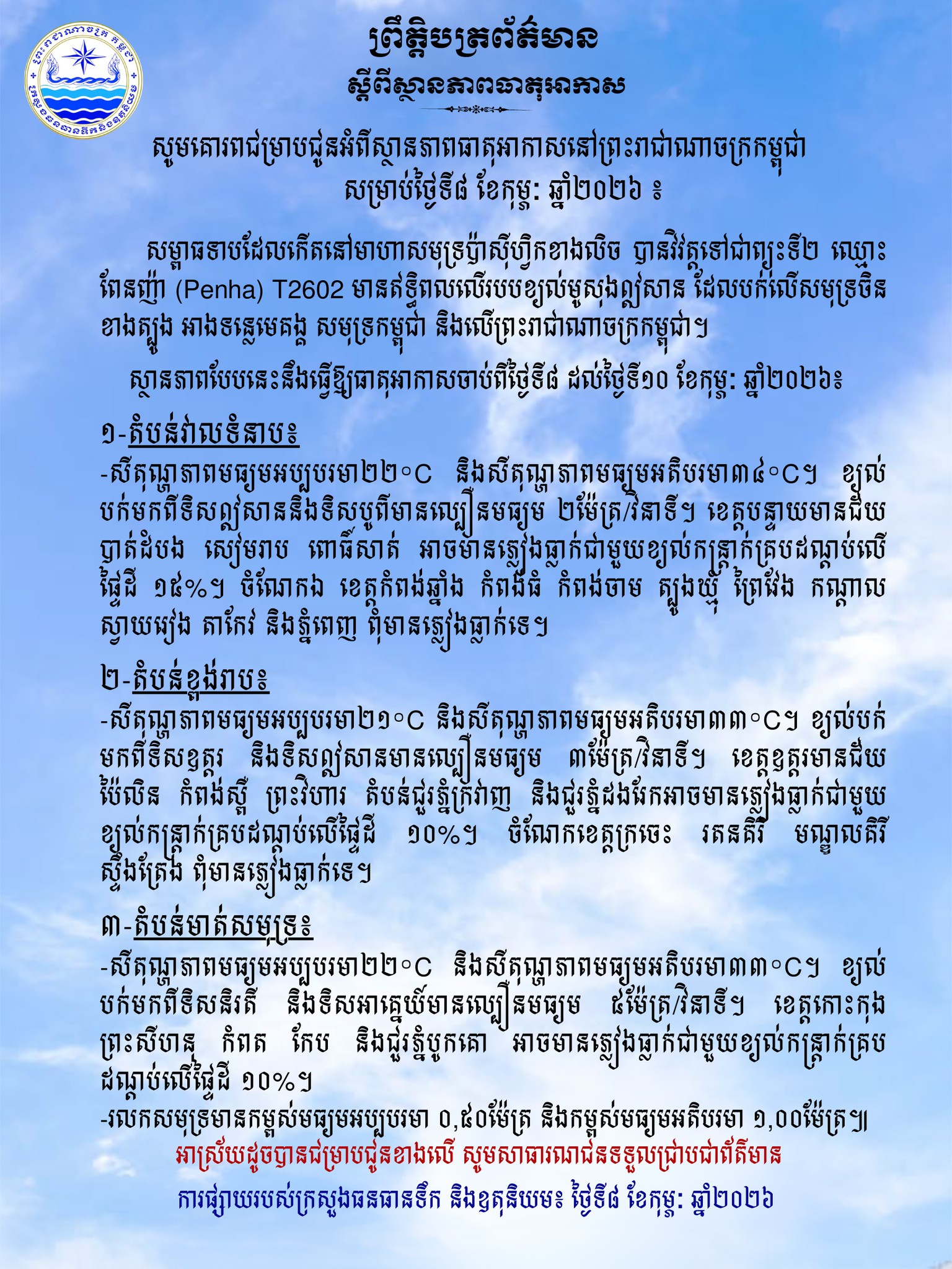 ក្រសួងធនធានទឹក ជូនដំណឹងអំពីស្ថានភាពធាតុអាកាសនៅកម្ពុជា សម្រាប់ថ្ងៃទី៨ ខែកុម្ភៈ ឆ្នាំ២០២៦