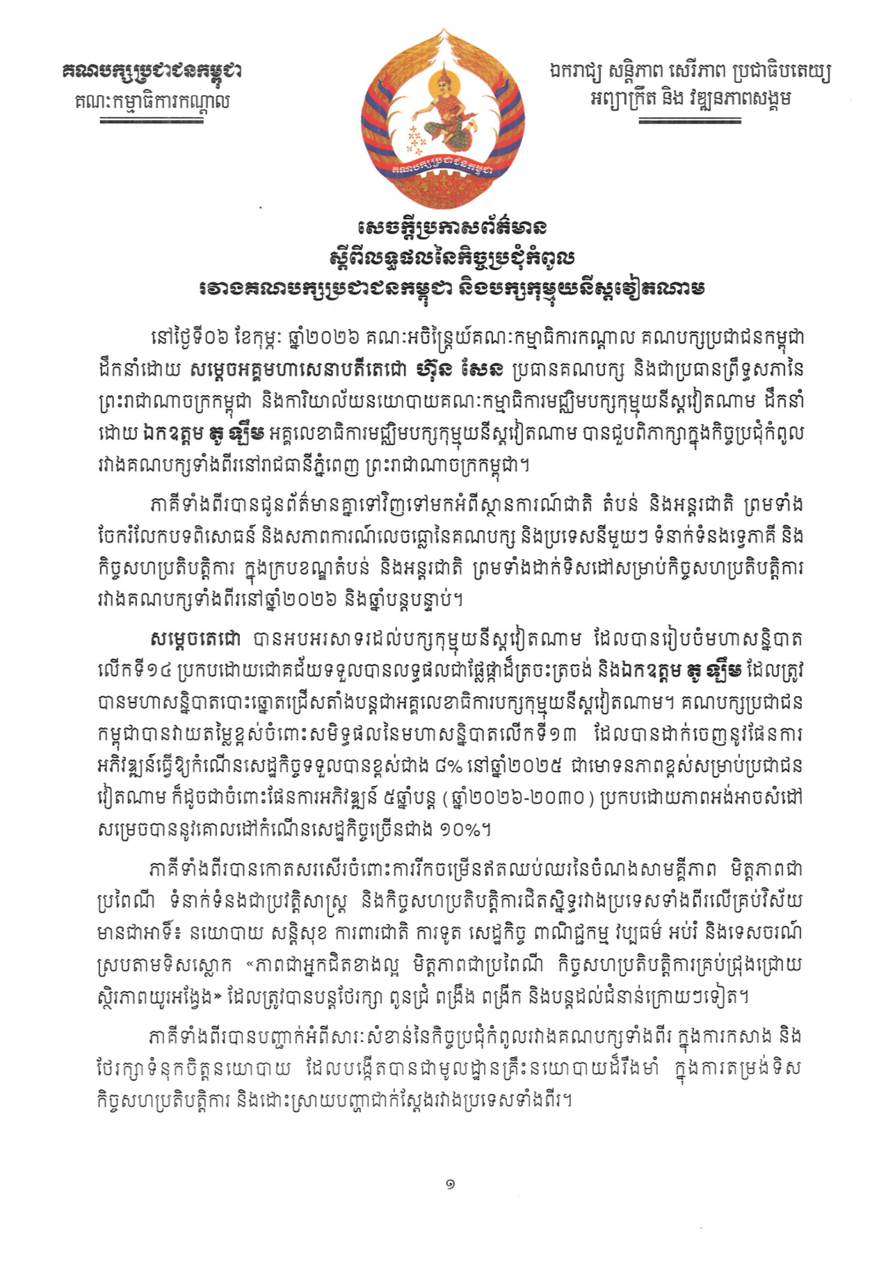 ខាងក្រោមនេះជា សេចក្តីប្រកាសព័ត៌មានស្តីពីលទ្ធផលនៃកិច្ចប្រជុំកំពូល រវាងគណបក្សប្រជាជនកម្ពុជា និងបក្សកុម្មុយនីស្តវៀតណាម៖