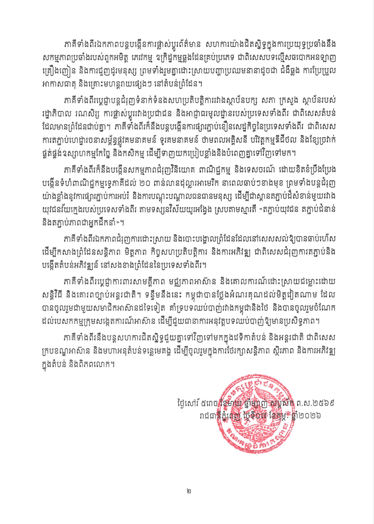 ភាគីទាំងពីរបានជូនព័ត៌មានគ្នាទៅវិញទៅមកអំពីស្ថានការណ៍ជាតិ តំបន់ និងអន្តរជាតិ ព្រមទាំង ចែករំលែកបទពិសោធន៍ និងសភាពការណ៍លេចធ្លោនៃគណបក្ស និងប្រទេសនីមួយៗ ទំនាក់ទំនងទ្វេភាគី និង កិច្ចសហប្រតិបត្តិការ ក្នុងក្របខណ្ឌតំបន់ និងអន្តរជាតិ ព្រមទាំងដាក់ទិសដៅសម្រាប់កិច្ចសហប្រតិបត្តិការ រវាងគណបក្សទាំងពីរនៅឆ្នាំ២០២៦ និងឆ្នាំបន្តបន្ទាប់។