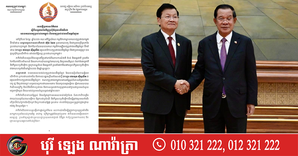 (ភ្នំពេញ)៖ នៅថ្ងៃទី០៧ ខែកុម្ភៈ ឆ្នាំ២០២៦ គណៈអចិន្ត្រៃយ៍គណៈកម្មាធិការកណ្តាលគណបក្សប្រជាជនកម្ពុជា ដឹកនាំដោយ សម្តេចអគ្គមហាសេនាបតីតេជោ ហ៊ុន សែន ប្រធានគណបក្ស និងជាប្រធានព្រឹទ្ធសភានៃ ព្រះរាជាណាចក្រកម្ពុជា និងការិយាល័យនយោបាយគណៈកម្មាធិការមជ្ឈិមបក្សប្រជាជនបដិវត្តន៍ឡាវ ដឹកនាំ ដោយ ឯកឧត្តម ថងលូន ស៊ីសូលីត អគ្គលេខាធិការបក្សប្រជាជនបដិវត្តន៍ឡាវ និងជាប្រធានរដ្ឋឡាវ បាន ជួបប្រជុំកំពូលលើកទី១៦ នៅរាជធានីភ្នំពេញ ព្រះរាជាណាចក្រកម្ពុជា។