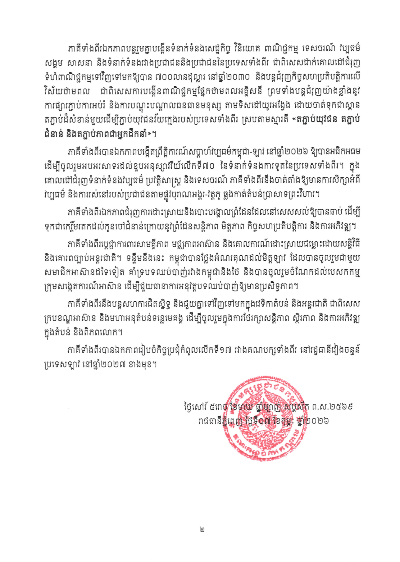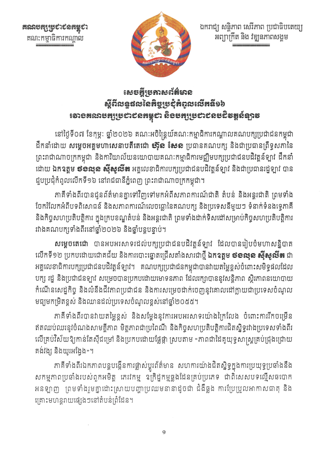 ខាងក្រោមនេះជាសេចក្តីប្រកាសអំពីលទ្ធផលនៃកិច្ចប្រជុំកំពូលលើកទី១៦ រវាងគណបក្សប្រជាជនកម្ពុជា និងបក្សប្រជាជនបដិវត្តន៍ឡាវ៖