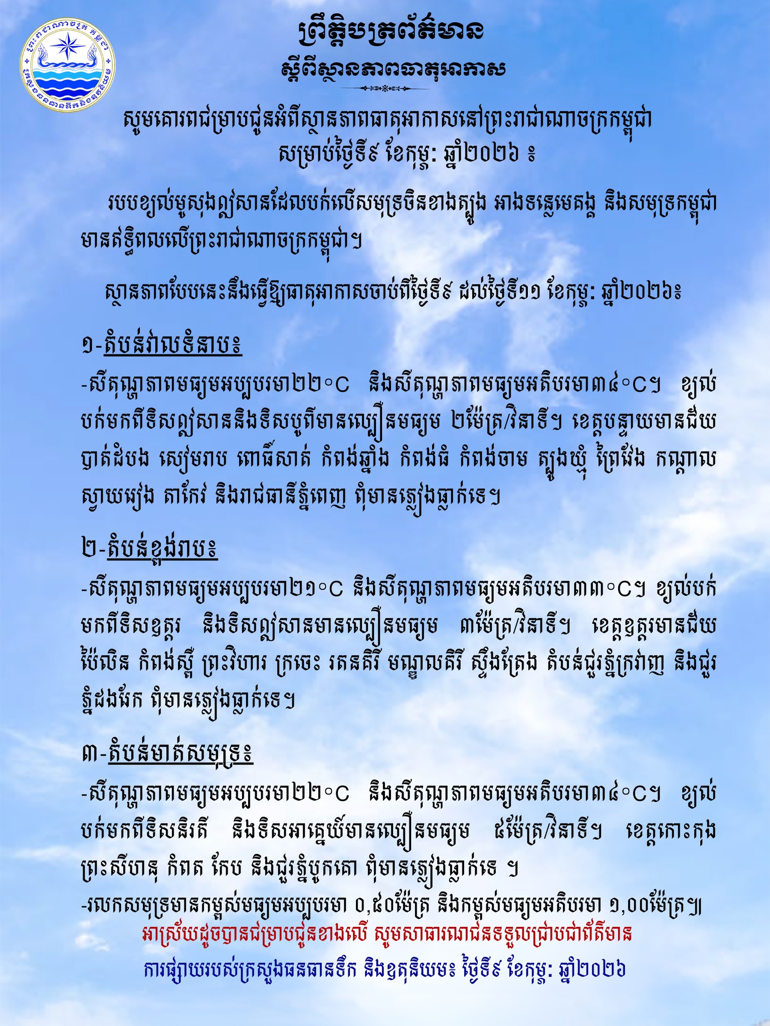 ក្រសួងធនធានទឹក ជូនដំណឹងអំពីស្ថានភាពធាតុអាកាសនៅកម្ពុជា សម្រាប់ថ្ងៃទី៩ ខែកុម្ភៈ ឆ្នាំ២០២៦