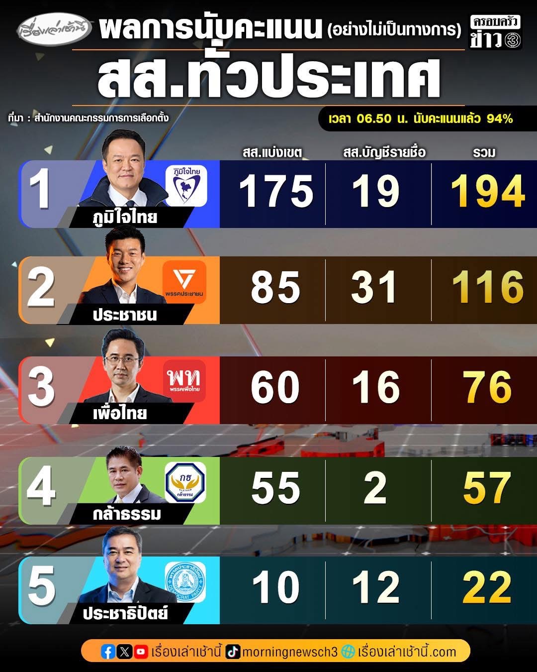 ២. គណបក្សប្រជាជនថៃទទួលបានអាសនៈ១១៦