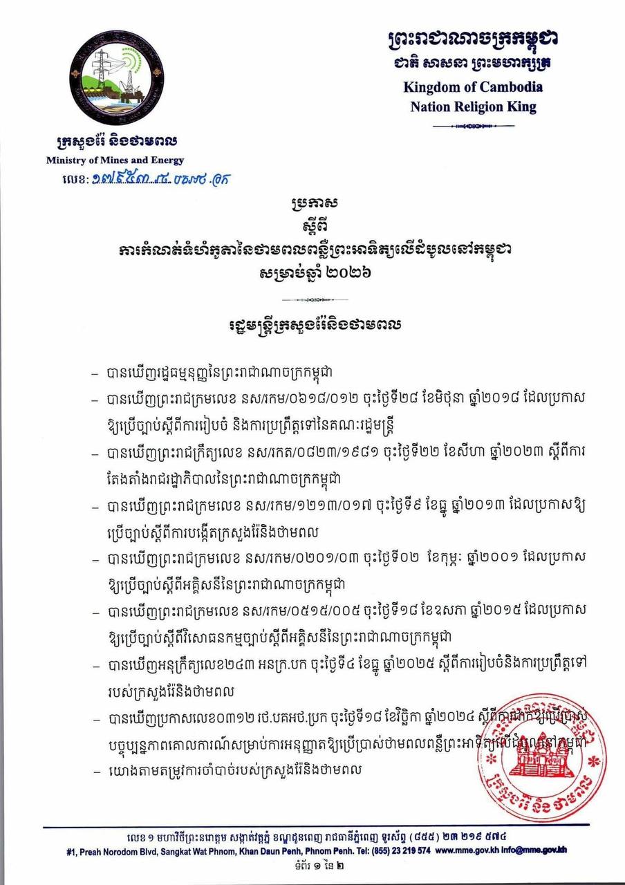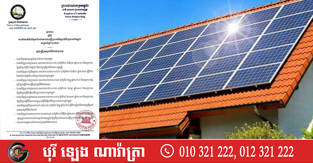 ក្រសួងរ៉ែ និងថាមពល អនុញ្ញាតផ្ដល់កូតា៣០មេហ្កាវ៉ាត់ ជូនអាជ្ញាធរអគ្គិសនីកម្ពុជាសម្រាប់ផ្ដល់ឱ្យអ្នកប្រើប្រាស់អគ្គិសនីដែលស្នើសុំដំឡើង និងប្រើប្រាស់ប្រព័ន្ធថាមពលពន្លឺព្រះអាទិត្យលើដំបូលក្នុងឆ្នាំ២០២៦ (Video inside)