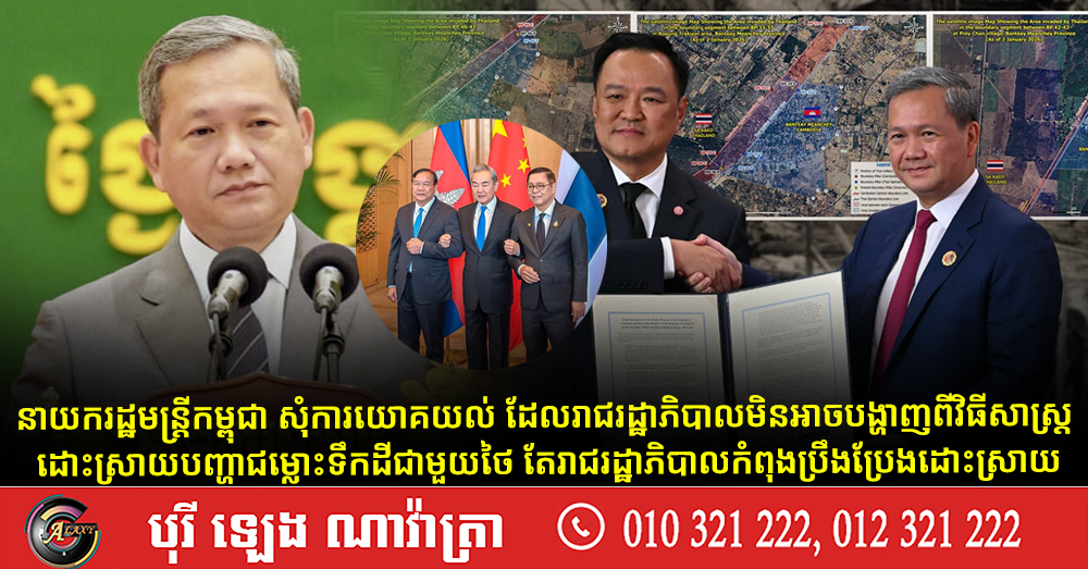 (ភ្នំពេញ)៖ សម្តេចមហាបវរធិបតី ហ៊ុន ម៉ាណែត នាយករដ្ឋមន្ដ្រីនៃកម្ពុជា នៅថ្ងៃទី១០ ខែកុម្ភៈ ឆ្នាំ២០២៦ បានសុំការយោគយល់ដល់ប្រជាពលរដ្ឋ ដែលរាជរដ្ឋាភិបាល មិនអាចបង្ហាញពីវិធីសាស្ត្រ ដោះស្រាយបញ្ហាជម្លោះទឹកដី ជាមួយថៃ តែរាជរដ្ឋាភិបាល បាននិងកំពុងប្រឹងប្រែងដោះស្រាយ។