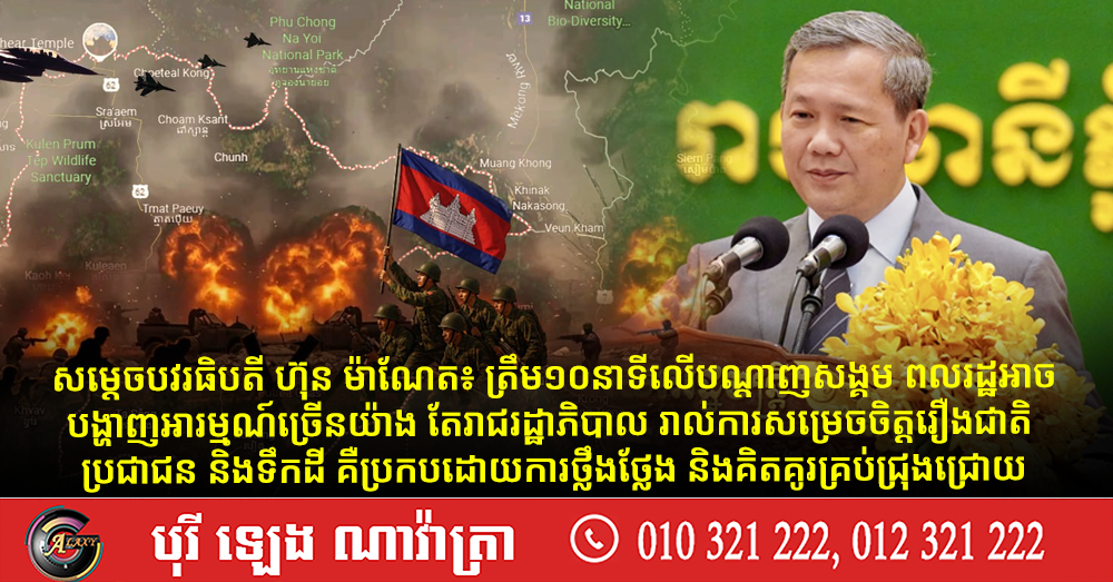 (ភ្នំពេញ)៖ សម្តេចមហាបវរធិបតី ហ៊ុន ម៉ាណែត នាយករដ្ឋមន្ត្រីនៃកម្ពុជា បានថ្លែងបញ្ជាក់ថា ក្នុងរយៈពេល១០នាទីប្រជាពលរដ្ឋលើបណ្តាញសង្គម អាចបង្ហាញអារម្មណ៍ច្រើនយ៉ាងបាន តែសម្រាប់រាជរដ្ឋាភិបាល រាល់ការសម្រេចចិត្ត គឺប្រកបដោយការថ្លឹងថ្លែង និងគិតគូរគ្រប់ជ្រុងជ្រោយទាំងទឹកដី ប្រជាពលរដ្ឋ និងកងកម្លាំង គ្រប់ជំហានទាំងអស់ នៃការសម្រេចចិត្តគឺដើម្បីឧត្តមប្រយោជន៍ជាតិ និងប្រជាជនខ្មែរ។