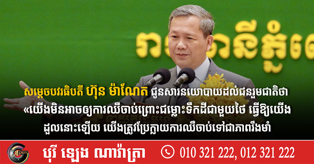 សម្តេចបវរធិបតី ហ៊ុន ម៉ាណែត ជូនសារនយោបាយដល់ជនរួមជាតិថា «យើងមិនអាចឲ្យការឈឺចាប់ព្រោះជម្លោះទឹកដីជាមួយថៃ ធ្វើឱ្យយើងដួលនោះឡើយ យើងត្រូវប្រែក្លាយការឈឺចាប់ទៅជាភាពរឹងមាំ (Video inside)
