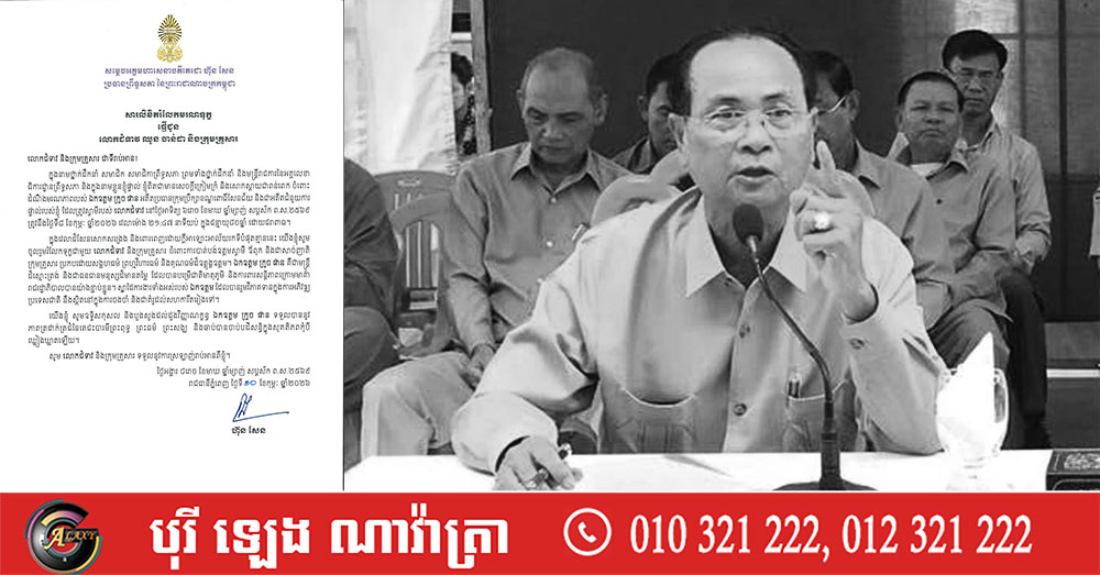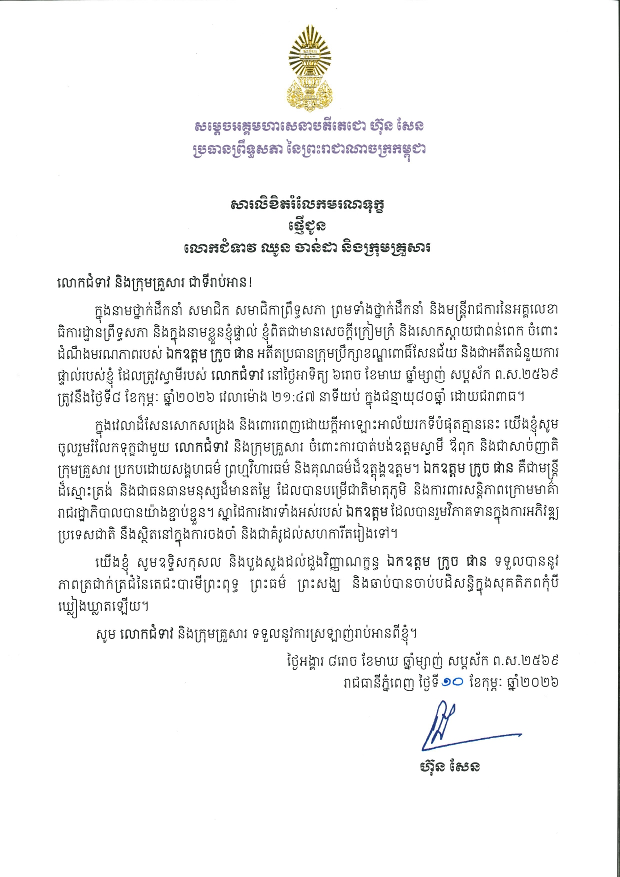 (ភ្នំពេញ)៖ សម្តេចតេជោ ហ៊ុន សែន ប្រធានព្រឹទ្ធសភានៃកម្ពុជា នៅថ្ងៃទី១០ ខែកុម្ភៈ ឆ្នាំ២០២៦នេះ បានផ្ញើសារលិខិតរំលែកមរណទុក្ខជូនលោកស្រី ឈូន ចាន់ដា និងក្រុមគ្រួសារ ចំពោះមរណភាពលោក ក្រូច ផាន អតីតប្រធានក្រុមប្រឹក្សាខណ្ឌពោធិ៍សែនជ័យ និងជាអតីតជំនួយការផ្ទាល់របស់សម្តេច។