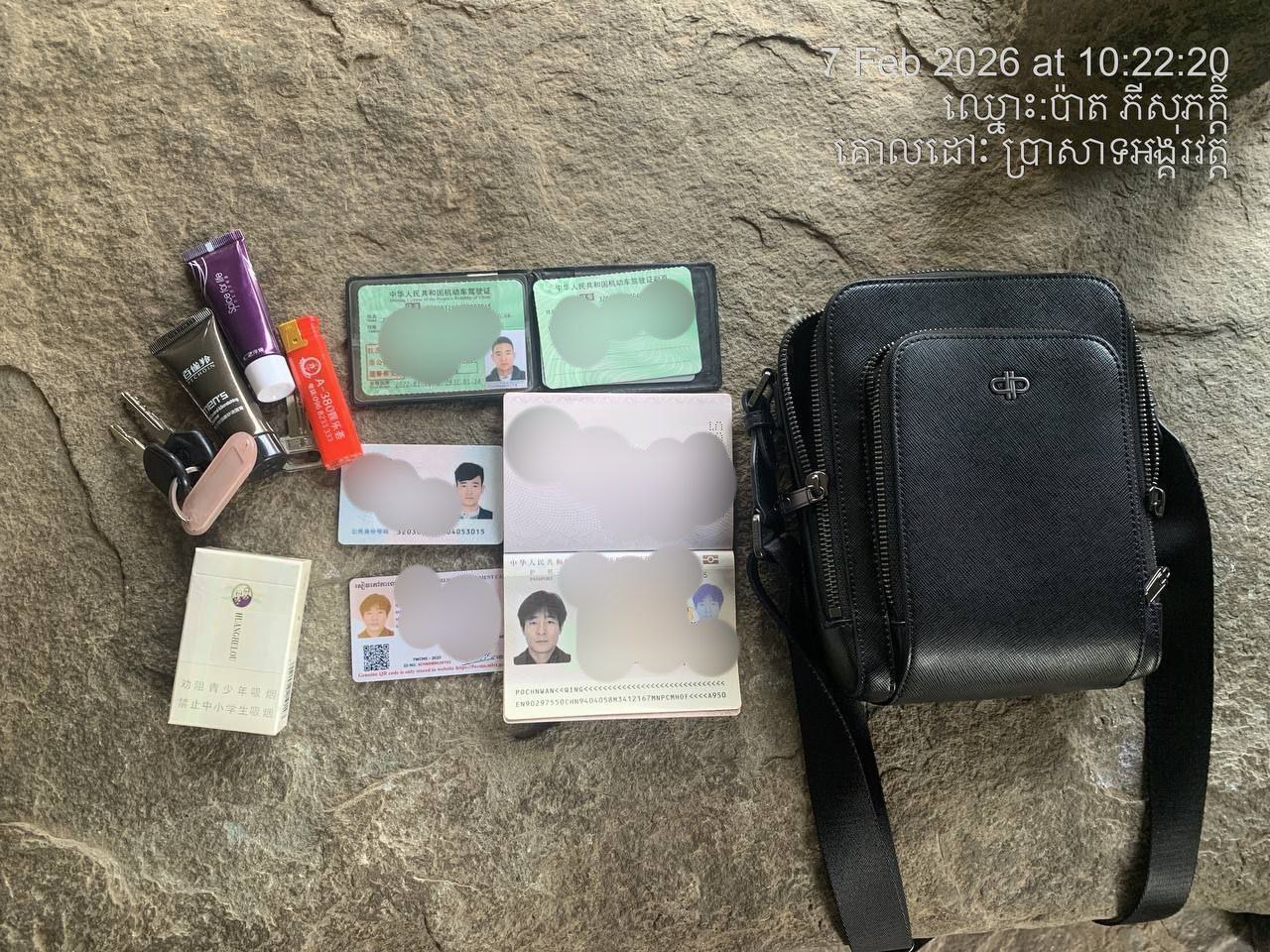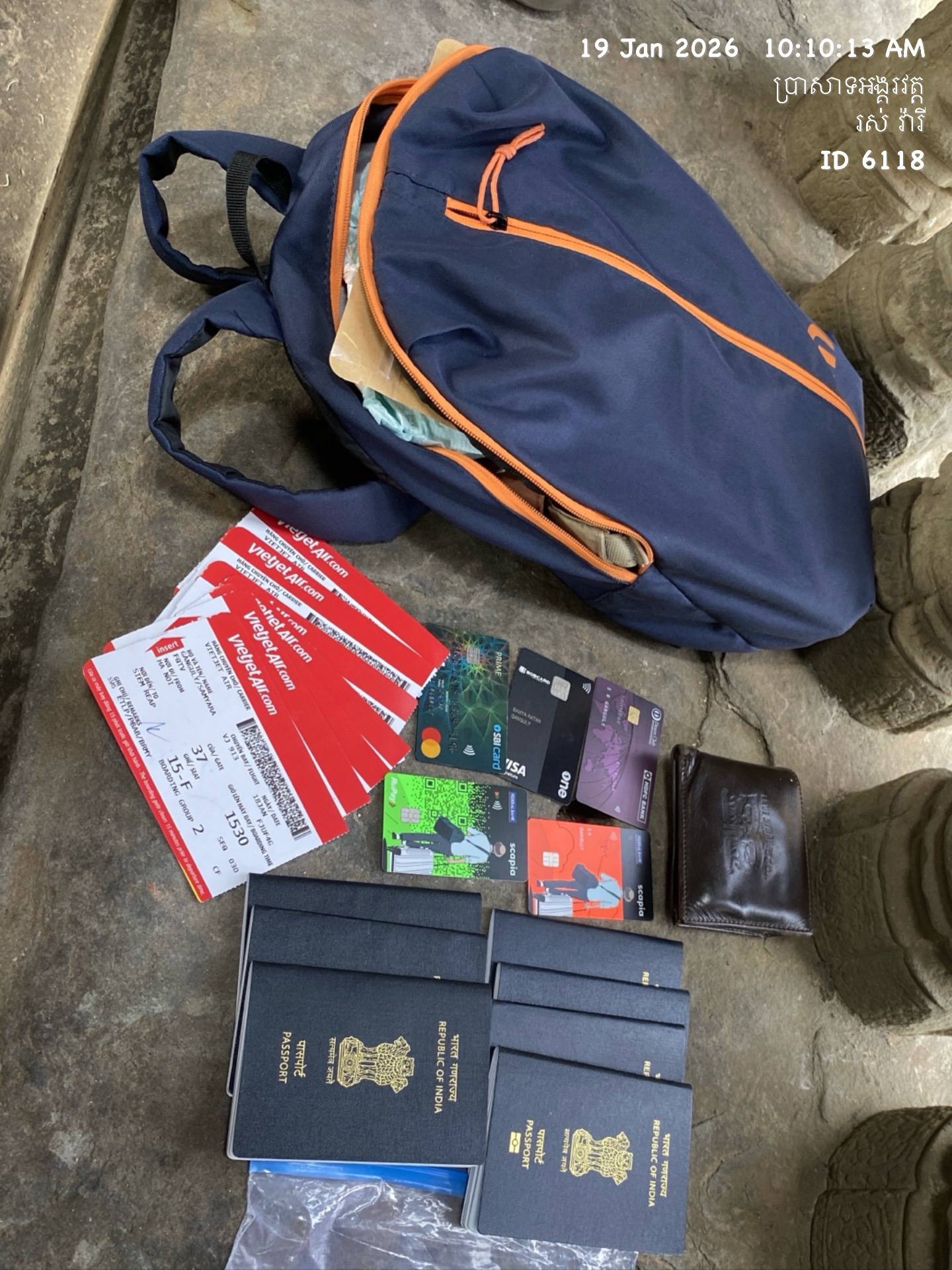 សម្ភារទាំងនោះរួមមាន៖ កាបូប ទូរសព្ទ ម៉ាស៊ីនថត កាត បន្តោងខ្សែក សៀវភៅ សំបុត្រចូលទស្សនាប្រាសាទ ឧបករណ៍ NEE WER ជាដើម -ល-។