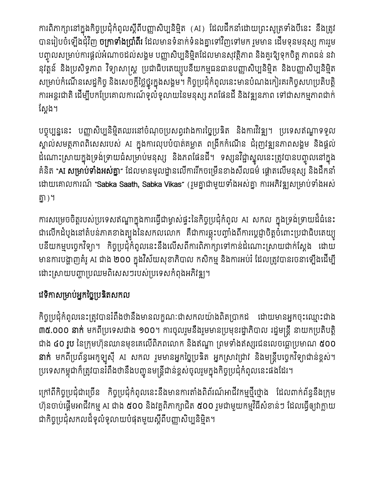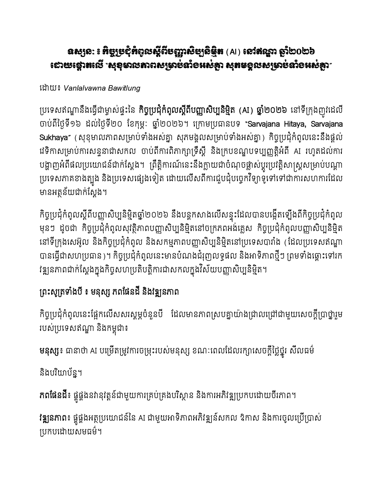 លោក Vanlalvawna Bawitlung បានបន្ថែមថា កិច្ចប្រជុំកំពូលស្តីពីបញ្ញាសិប្បនិម្មិតឆ្នាំ២០២៦ នឹងបន្តកសាងលើសន្ទុះដែលបានបង្កើតឡើងពីកិច្ចប្រជុំកំពូលមុនៗ ដូចជា កិច្ចប្រជុំកំពូលសុវត្ថិភាពបញ្ញាសិប្បនិម្មិតនៅចក្រភពអង់គ្លេស កិច្ចប្រជុំកំពូលបញ្ញាសិប្បនិម្មិតនៅទីក្រុងសេអ៊ូល និងកិច្ចប្រជុំកំពូល និងសកម្មភាពបញ្ញាសិប្បនិម្មិតនៅប្រទេសបារាំង (ដែលប្រទេសឥណ្ឌាបានធ្វើជាសហប្រធាន)។ កិច្ចប្រជុំកំពូលនេះមានបំណងជំរុញលទ្ធផល និងអាទិភាពថ្មីៗ ព្រមទាំងឆ្ពោះទៅរកវឌ្ឍនភាពជាក់ស្តែងក្នុងកិច្ចសហប្រតិបត្តិការជាសកលក្នុងវិស័យបញ្ញាសិប្បនិម្មិត៕