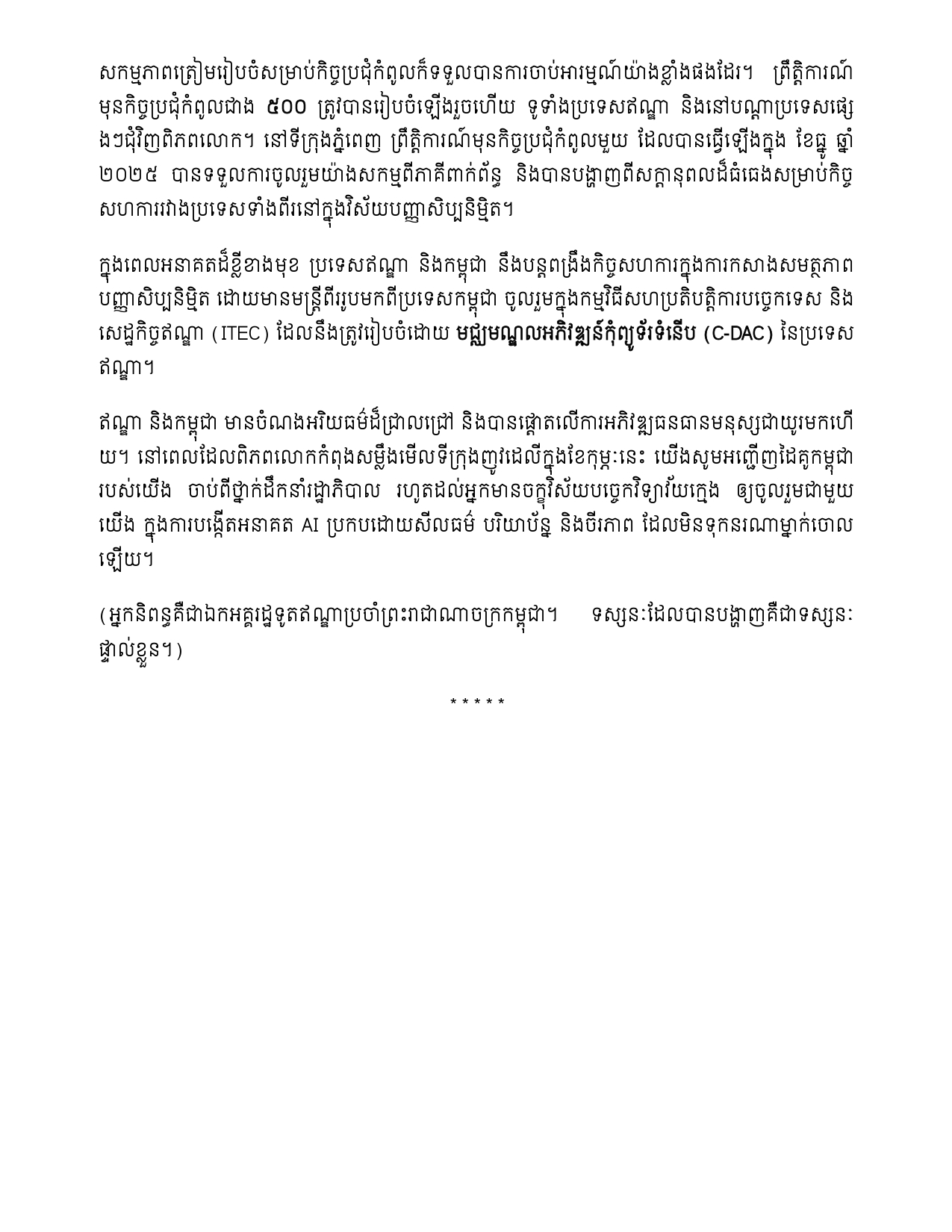 ទស្សនៈរបស់ឯកអគ្គរដ្ឋទូតឥណ្ឌាប្រចាំកម្ពុជា ជុំវិញកិច្ចប្រជុំកំពូល ស្តីពីបញ្ញាសិប្បនិម្មិត (AI) នៅឥណ្ឌា ឆ្នាំ២០២៦
