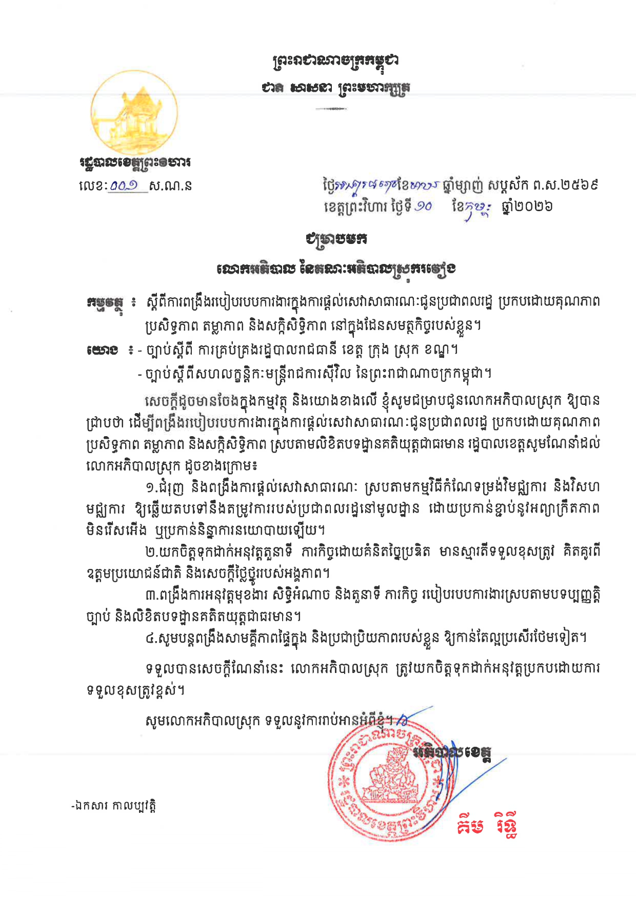 (ព្រះវិហារ)៖ អភិបាលខេត្តព្រះវិហារ លោក គីម រិទ្ធី បានផ្ញើលិខិតទៅអភិបាលស្រុករវៀង លោក ប៊ុន ហួរ ឲ្យពង្រឹងរបៀបរបបការងារក្នុងការផ្តល់សេវាសាធារណៈជូនប្រជាពលរដ្ឋ ប្រកបដោយគុណភាព ប្រសិទ្ធភាព តម្លាភាព និងសក្តិសិទ្ធិភាព នៅក្នុងដែនសមត្ថកិច្ចរបស់ខ្លួន។ នេះបើតាមលិខិតដែលបណ្តាញព័ត៌មាន Fresh News ទទួលបាននៅថ្ងៃទី១០ ខែកុម្ភៈ ឆ្នាំ២០២៦។