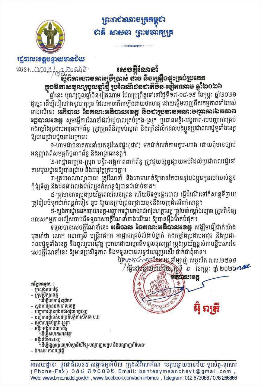រដ្ឋបាលខេត្តបន្ទាយមានជ័យ ហាមប្រើប្រាស់ផាវ និងគ្រឿងផ្ទុះគ្រប់ប្រភេទ ក្នុងឱកាសបុណ្យចូលឆ្នាំចិន-វៀតណាម