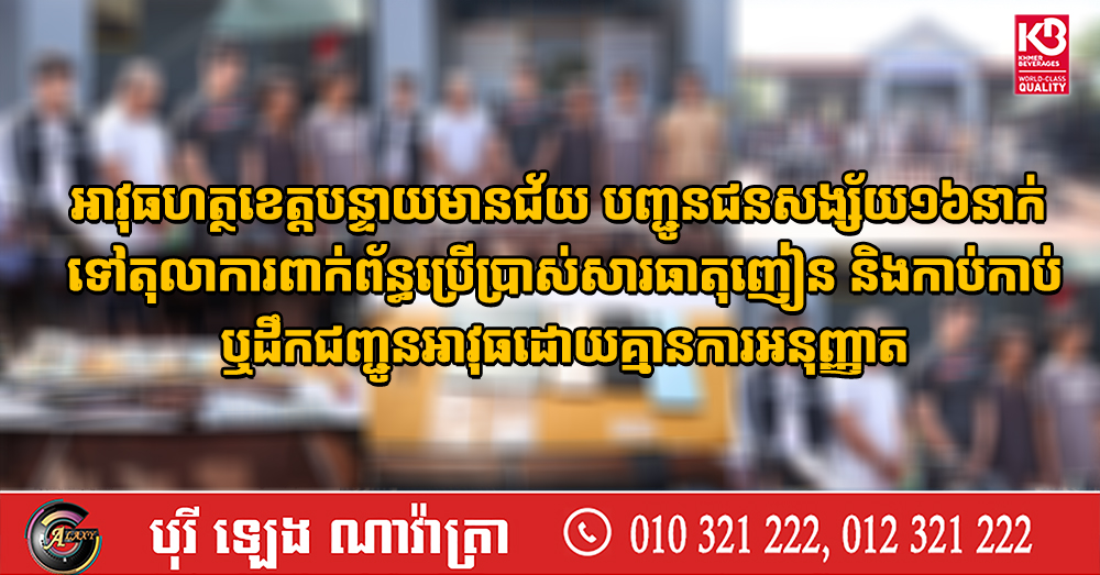 អាវុធហត្ថខេត្ដបន្ទាយមានជ័យ បញ្ជូនជនសង្ស័យ១៦នាក់ ទៅតុលាការពាក់ព័ន្ធប្រើប្រាស់សារធាតុញៀន និងកាប់កាប់ ឬដឹកជញ្ជូនអាវុធដោយគ្មានការអនុញ្ញាត