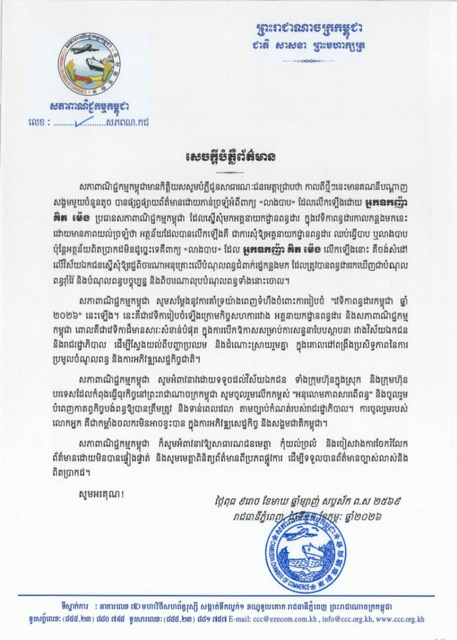 សភាពាណិជ្ជកម្មកម្ពុជា ចេញសេចក្ដីបំភ្លឺព័ត៌មាន ជុំវិញអត្ថន័យពិតនៃការប្រើពាក្យ «លាងបាប» របស់អ្នកឧកញ៉ា គិត ម៉េង ដែលលើកឡើងក្នុងវេទិកាពន្ធដារកម្ពុជា ឆ្នាំ២០២៦