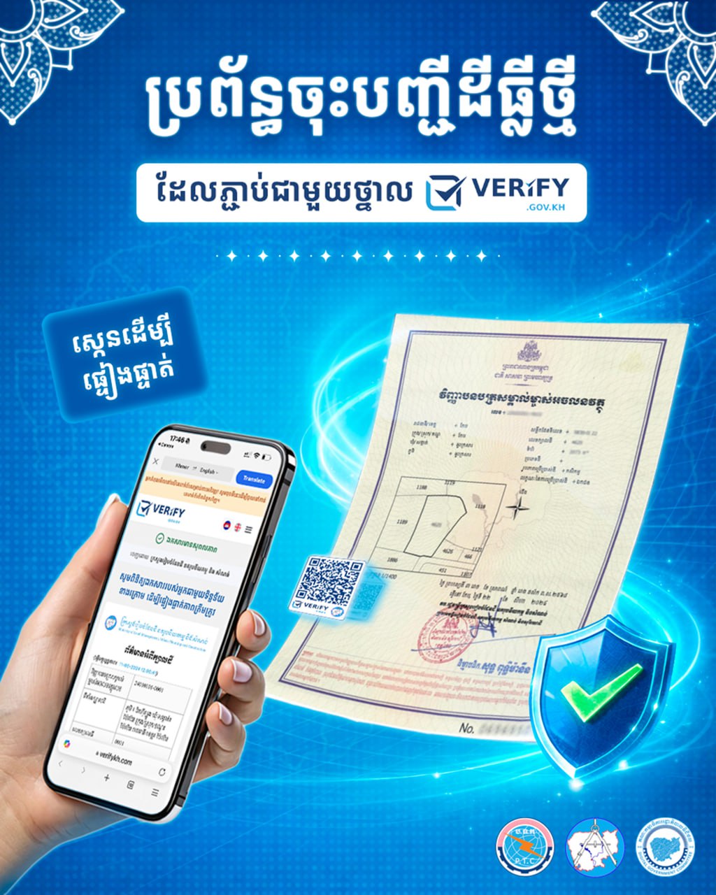 វិញ្ញាបនបត្រសម្គាល់ម្ចាស់អចលនវត្ថុទម្រង់ថ្មី មានភ្ជាប់ជាមួយ QR Code ថ្នាល verify.gov.kh គឺជាសមិទ្ធផលថ្មីរបស់ក្រសួងរៀបចំដែនដី នគរូបនីយកម្ម និងសំណង់ ក្រសួងប្រៃសណីយ៍និងទូរគមនាគមន៍ និងគណៈកម្មាធិការរដ្ឋាភិបាលឌីជីថល ដែលបង្ហាញពីវឌ្ឍនភាពដ៏សំខាន់នៃបរិវត្តកម្មឌីជីថលរបស់កម្ពុជា តាមរយៈការផ្តល់សេវាសាធារណៈឱ្យកាន់តែប្រសើរ ស្របតាមគោលនយោបាយរដ្ឋាភិបាលឌីជីថលកម្ពុជា ២០២២-២០៣៥។